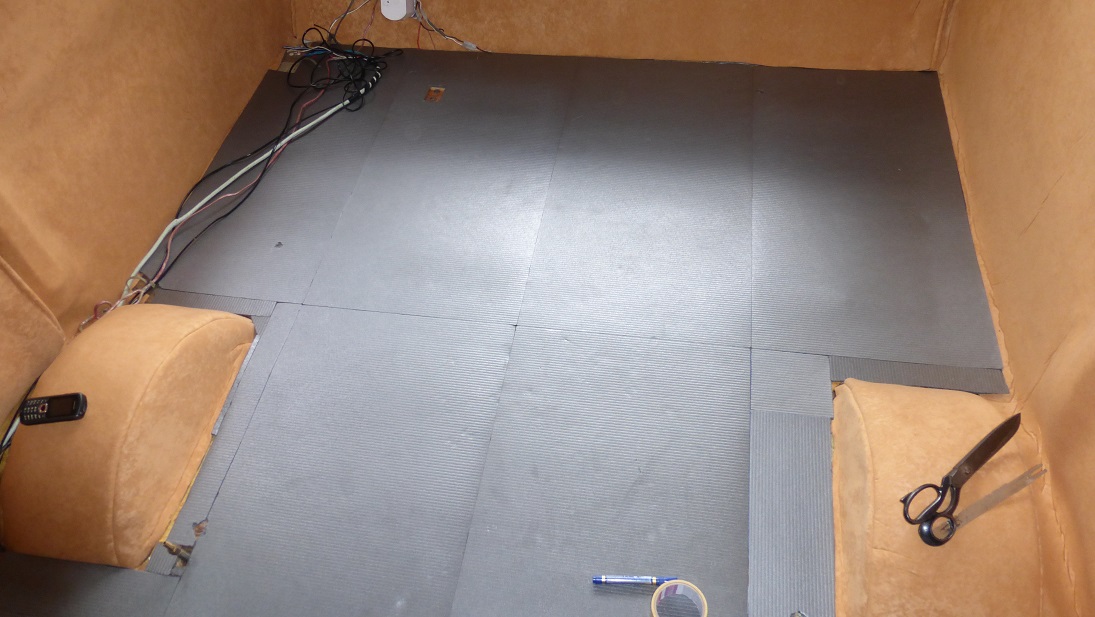 Podłoga skończona. Zostało ułożone ocieplenie z takich płyt jak na zdjęciu, przyklejonych na taśmę dwustronną do podłogi. Nie wiem jak się nazywają ale są ciepłe i na tyle twarde, że chodzenie po nich nie powoduje wygniatania się. Grubość to około 4-5mm. Jedna paczka tego towaru starczyła w sam raz na eNkę. Na to ułożyłem nową wykładzinę również przyklejając ją na taśmę. Miałem trochę obawy, że podłoga podniesie się za bardzo ale jest OK, szafa weszła normalnie na miejsce tylko lekko dotyka do sufitu, przy progu też nie jest za wysoko. Po podłodze chodzi się normalnie, nie czuć żadnego uginania się czy czegoś takiego.