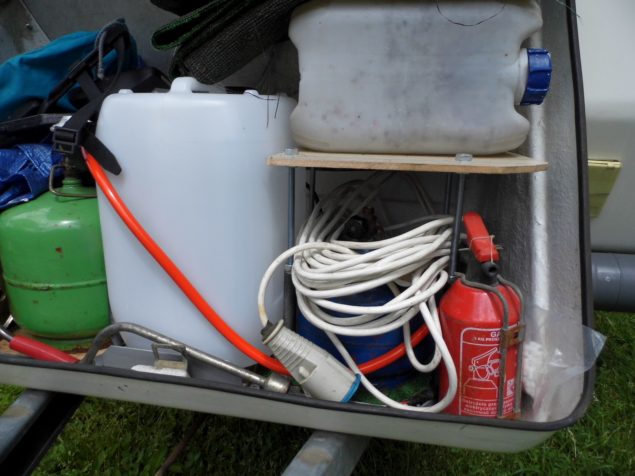 Zawsze wkurzało mnie to, że mając w bakiście pojemnik na wodę i dwie butle gazowe nie mam gdzie położyć baniaka na brudną wodę i innych szpargałów by podczas jazdy nie uszkodziły mi zaworu zapasowej butli. Przy przerabianiu stelaża butli by mi wchodziła na jesienne wyjazdy duża 11kg butla i zabudowywaniu tylnej ściany bakisty, narodził mi się pomysł regulowanej na wysokość, szybko wyjmowanej półeczki. Półeczka ma zakres regulacji dopasowany do butli 2kg i 3kg w zależności jaką butlę bierzemy na zapas, nakrętkami mogę opuścić lub podnieść półkę tuż nad zawór butli. Na zdjęciu półka w ustawieniu na 3kg butlę a stoi pod nią 2kg.