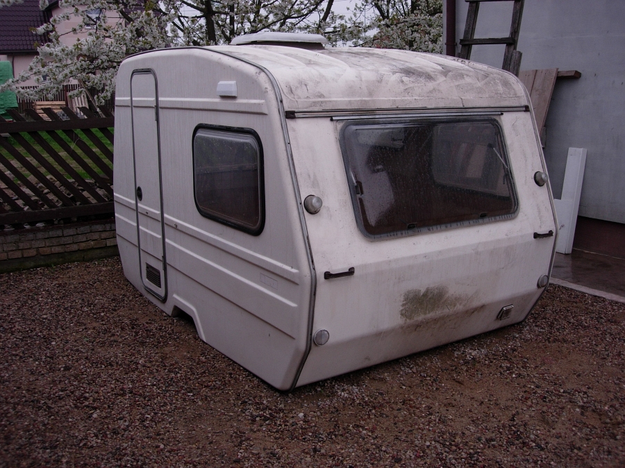 Stan wyjściowy to brudny trupek, z meblami i wiszącą tapicerką. Czyli jak u większości. Budkę zdjęliśmy i doczyściliśmy chemią ile się dało. Dach doszczelniłem od wewnątrz żywicą, z zewnątrz wylakierowałem dach na szaro, nowe kedry, nowe uszczelki szyb otwieranych, polerka szyb, wymiana osprzętu zewnętrznego. Na koniec ozdobny pasek aby przełamać tę monotonię białego koloru.