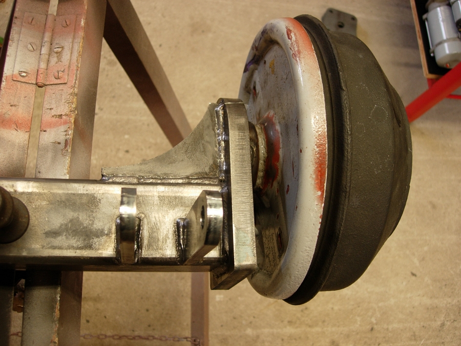 12. Następnie bierzymy największą kątówkę jaką mamy i obcinamy od wahaczyków całe piasty z tarczami kotwicznymi. Resztę z ulgą wyrzucamy na złom. Piasty montujemy w tokarce i podtaczamy na wymiar 55mm i głębokość 15mm koncówki wahaczyków – te okrągłe odkuwki w które wspawane są oryginalnie czopy.