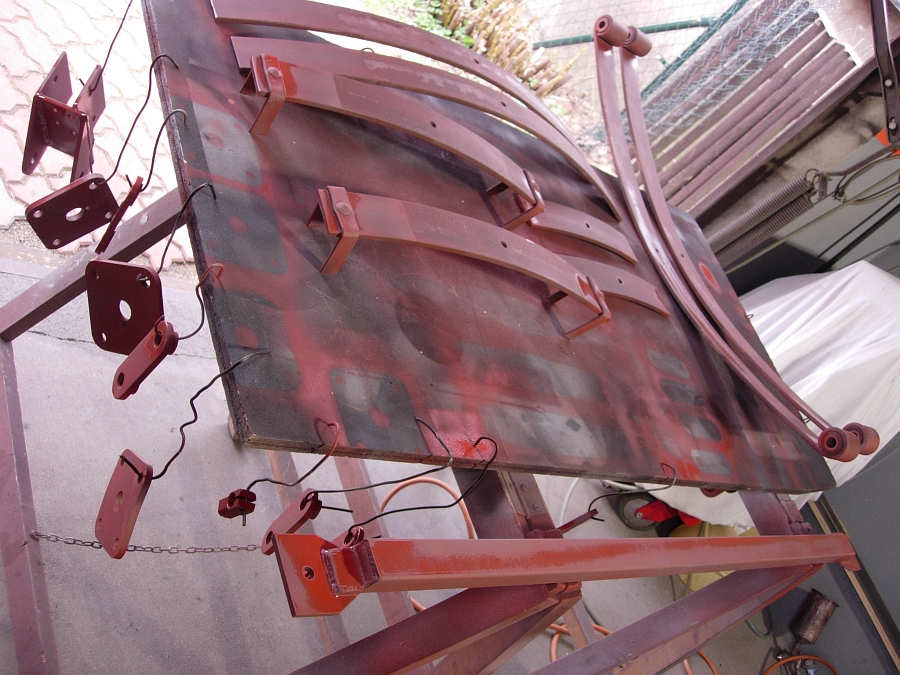 7. Po tych zabiegach otrzymamy taki zestaw jak poniżej. Jak widać przednie uchwyty resorów obejmują ramę z obu stron bo rama jest zamknięta od wewnątrznej strony w tym miejscu wzmocnieniem – i ma przekrój []. Tylne uchwyty trzymają tylko bokiem i dołem – bo tam rama ma przekrój [