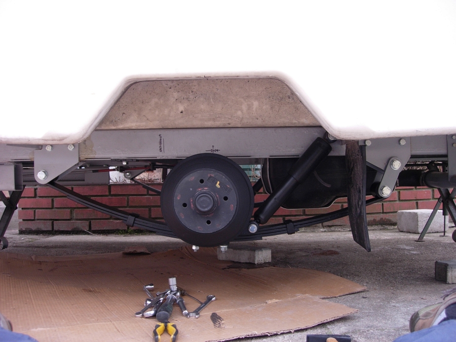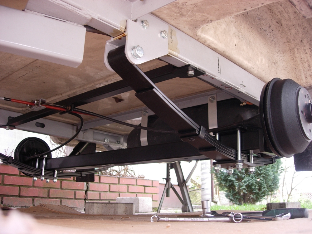 Ponieważ po paru wyjazdach zauważyłem że szafka kuchenna zaczyna robić kantem blatu dziurę w nowej tapicerce (właśnie od podskoków przyczepy) – miara się przebrała i podjąłem decyzję o wyrzuceniu tego gówna na złom i budowie nowego zawieszenia. Przy okazji chciałem poszerzyć całe zawieszenie o 6cm i nawet obniżyć o 1-2cm względem oryginału.