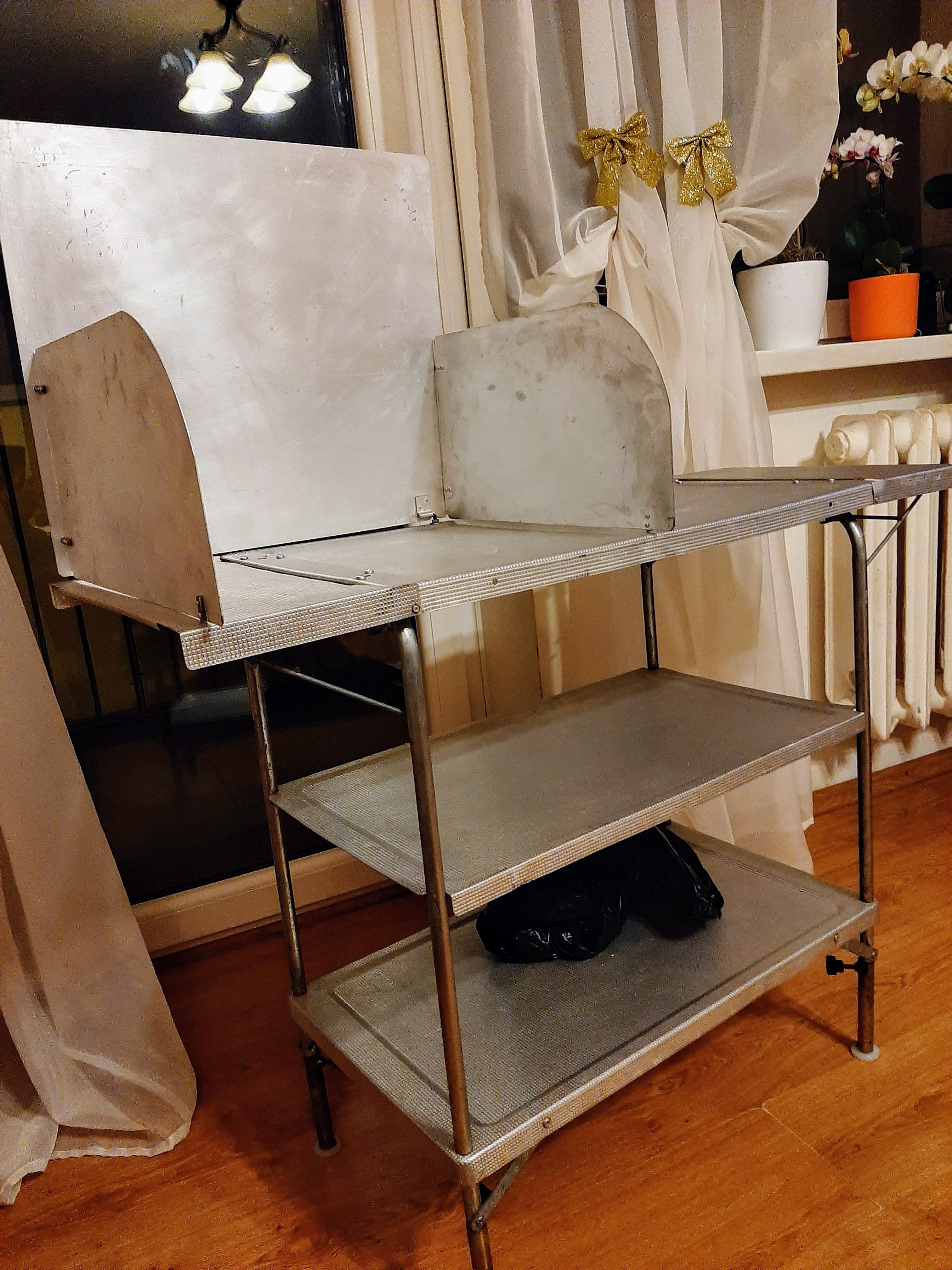 Kupiłem taki stolik i dołożyłem blachy-osłony kuchenki gazowej z enki oraz rurki na nogach z śrubami do ustawiania stolika w poziomie . Zrobiłem też płytę pod radio i gniazdo USB która będzie zamontowana pod szafką po lewej stronie drzwi wejściowych .