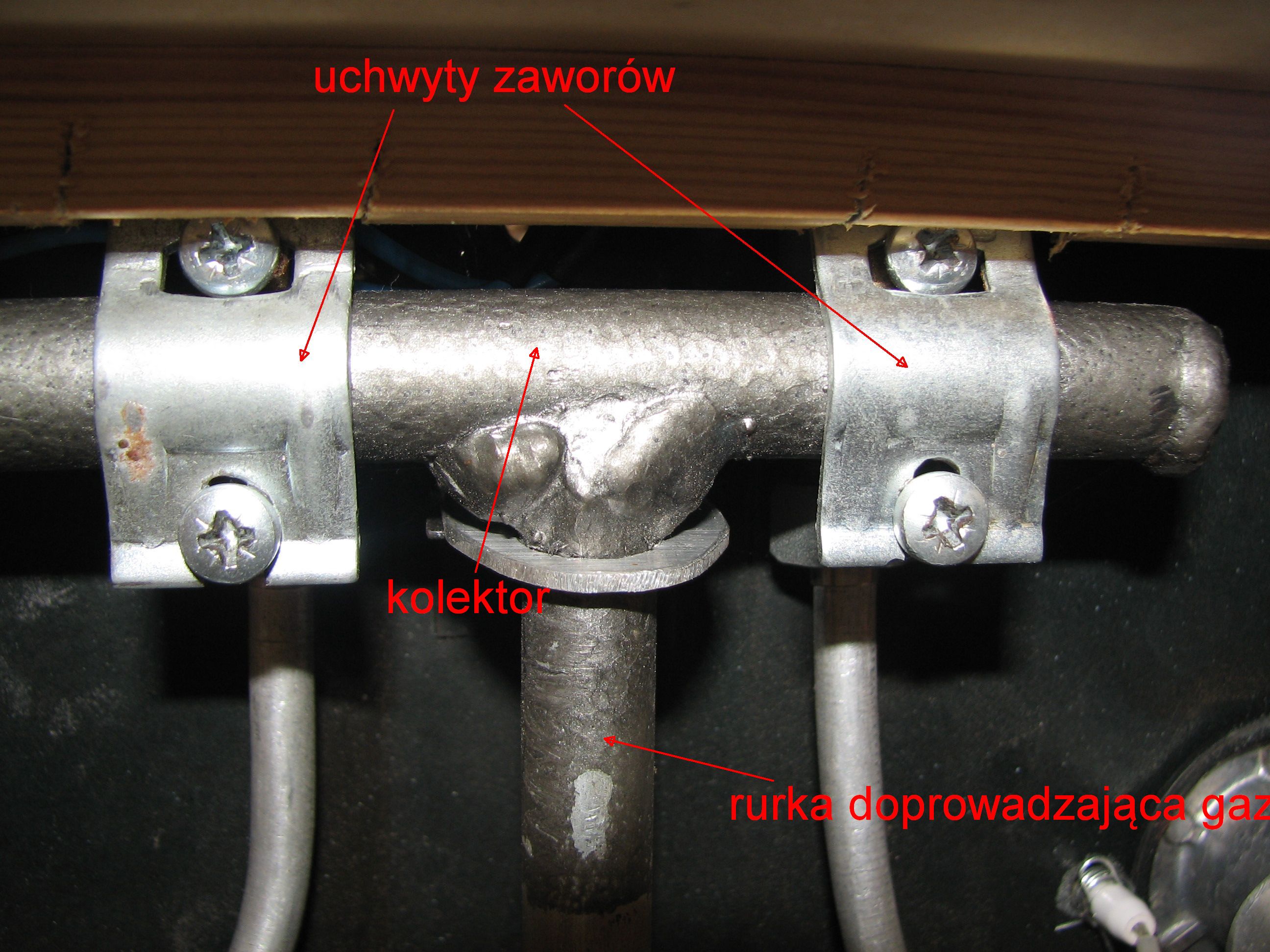 Zawory zamocowałem do wykonanego ze stalowej rurki kolektora przyspawanego do fabrycznej rurki doprowadzającej gaz z gwintem do przykręcenia końcówki węża gumowego. Końce kolektora zostały zaspawane. Po spawaniu sprawdziłem szczelność kolektora podłączając go do butli gazowej i zanurzając do wody. Położenie szczelnego spawu wcale nie jest takie proste! Pamiętam, że poprawiałem kilkakrotnie do uzyskania całkowitej szczelności. Dopiero po tej próbie wywierciłem otwory doprowadzające gaz do zaworów. Teraz można było zmontować całą kuchnię. Do zamocowania rurki doprowadzającej gaz wykonałem wsporniczek z blachy aluminiowej, widoczny na fot. 1.Na fot. 3 widać zewnętrzny palnik. Niestety, nie ma on sprężynowego zatrzasku mocującego, jak niewiadowski i dlatego lepiej jest na czas podróży zdejmować palniki, aby nie uszkodziły emaliowanej płyty kuchenki. Palniki te są również wyższe od oryginalnych, co spowodowało konieczność podwyższenia rusztu za pomocą tulejek z rurki aluminiowej, co widać na fot. 4.Tak wykonana kuchenka działa bezbłędnie od 13 lat.