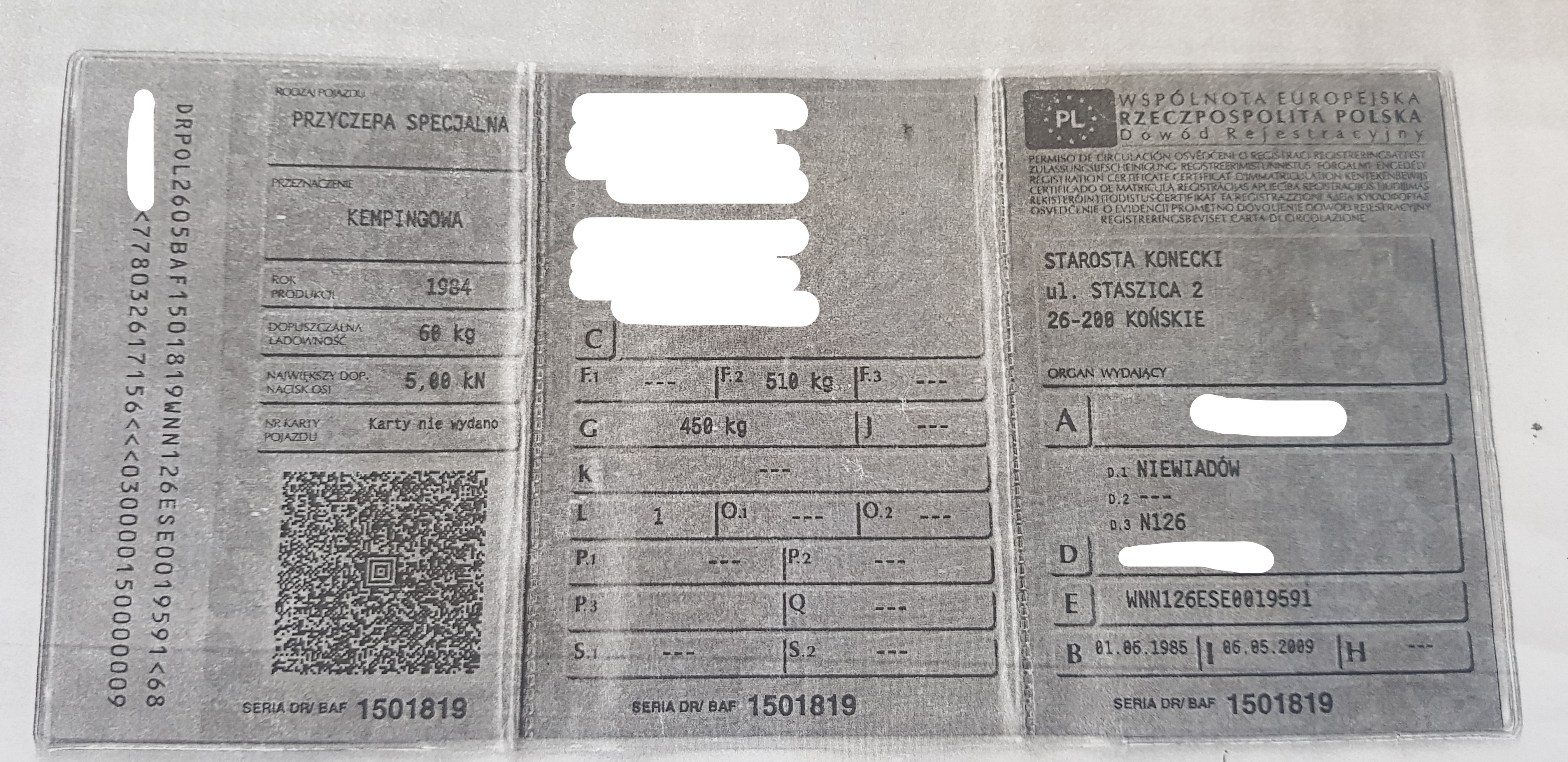 Tak jako ciekawostka. Parę dni temu kupiłem N126e. Poszedłem do Komunikacji w celu rejestracji (ciągłość umów, dowód z wpisanym DMC, przeglądem bezterminowym, itp - skan dowodu w załączniku). 3h w kolejce, no ale się  doczekałem. A pani w okienku po sprawdzeniu dowodu i umów, twierdzi, że nie może zarejestrować z bezterminowym przeglądem, gdyż w miejscu rodzaj pojazdu mam napisane, że przyczepka jest SPECJALNA, a ma być że LEKKA - pani twierdziła, że przyczepka specjalna podlega obowiązkowemu corocznemu przeglądowi. Na nic zdały się tłumaczenia, że każdy dowód od Niewiadówki ma taki wpis i że jest podane DMC mniejsze niż 750kg, więc z tego wynika, że to przyczepka lekka. Aby uniknąć corocznych przeglądów pani dała tablice tymczasowe i wysłała mnie do diagnosty na przegląd aby określił typ pojazdu - zaznaczyła że musi być taki zapis PRZYCZEPKA LEKKA-SPECJALNA-KEMPINGOWA. Więc ok, co robić. Stację okręgową mam 10min od domu, więc tego samego dnia zaciągnąłem tam przyczepkę. Diagnosta wyśmiał panią z urzędu, że bez jego opini też może zmienić te dane, gdyż ma DMC, no ale napisał tak jak chciała -  PRZYCZEPKA LEKKA-SPECJALNA-KEMPINGOWA (koszt 79zł). Kolejnego dnia tym razem 4h w kolejce (w czasach niby panującej pandemii). Już trafiłem do innej Pani, a ona mówi, tym razem, że Niewiadów nie może tak określać przyczep - jako specjalna i że mam zwrócić się do Niewiadowa o wyjaśnienia