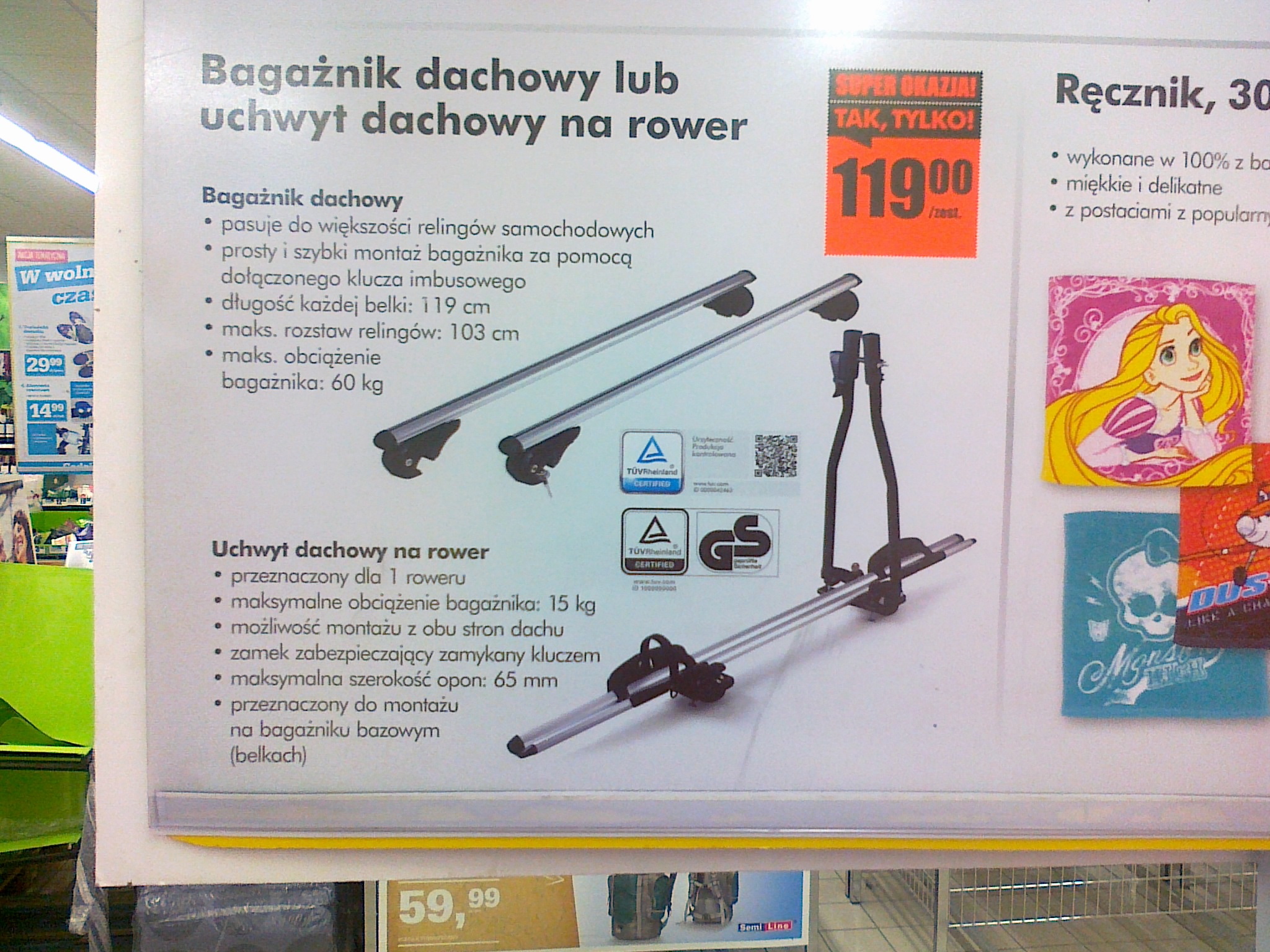 Dziś będąc w Biedronce zauważyłem w ofercie aluminiowe bagażniki rowerowe i bazy na relingi (patrz zdjęcie) za 119 PLN, teraz po przyjeździe do domu zastanawiam się czy nie kupić tej bazy, bo przydały by się rowerki na wyjeździe z przyczepką na urlop, a w sumie na ten jeden może dwa wyjazdy w roku może by wystarczyła ta baza??? (Do wyjazdów samym samochodem mam bagażnik na hak).
