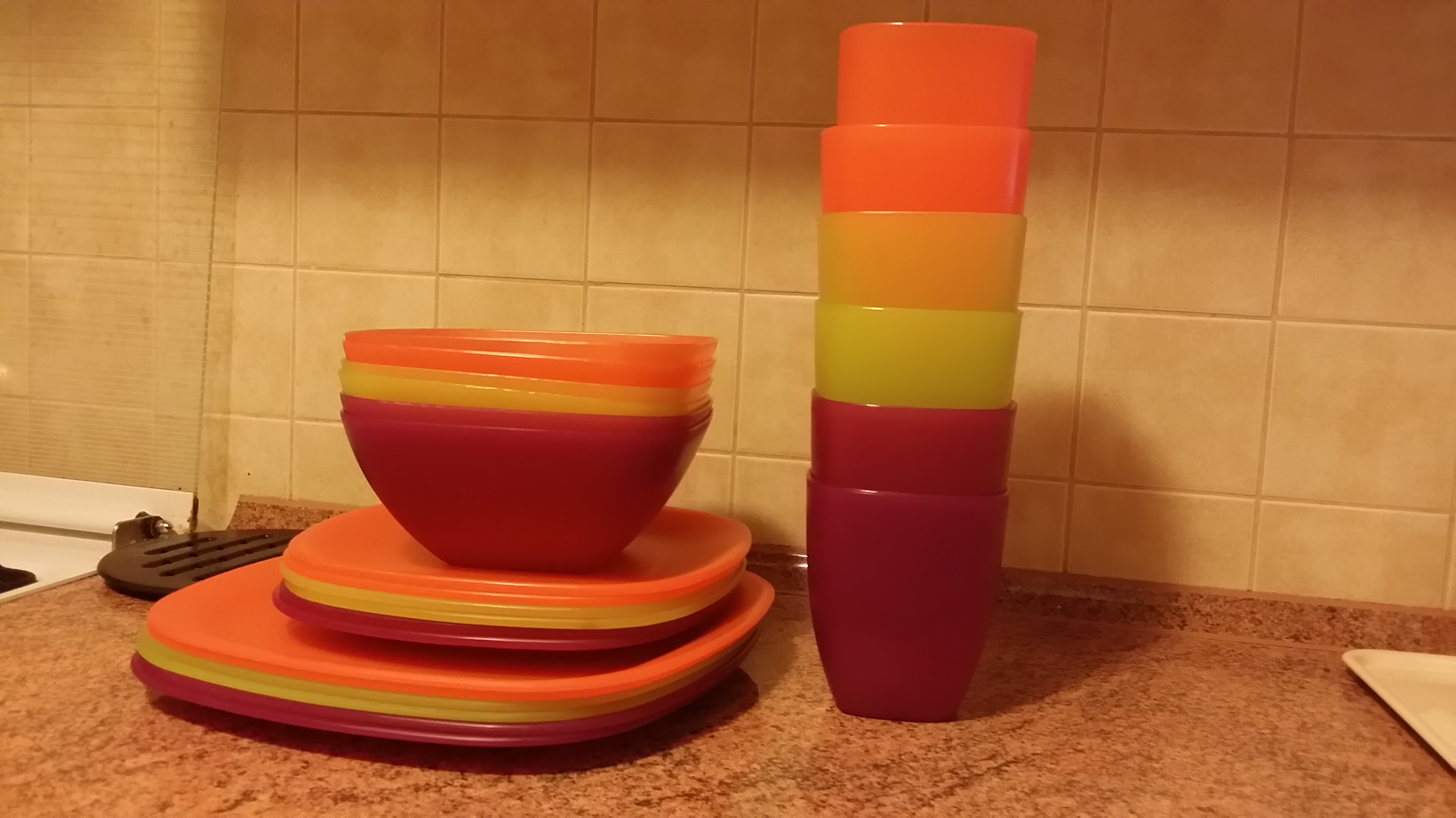 Wczoraj po powrocie z Majówki szybki wypad do Biedronki, bo przypomniało mi się, że będą plastikowe naczynia na wagę. W ramach ograniczania kilogramów cała porcelana (poza 2 kubkami do kawy, bo nie wyobrażam sobie pić z plastiku) uległa właśnie wymianie na tworzywo. Cena za kg 25 plnów. To co na fotce czyli 6 kompletów talerz, micha i kubek kosztowało coś koło 33 plnów. Dzisiaj chyba jeszcze skoczę dokupić kilka małych talerzyków śniadaniowych.