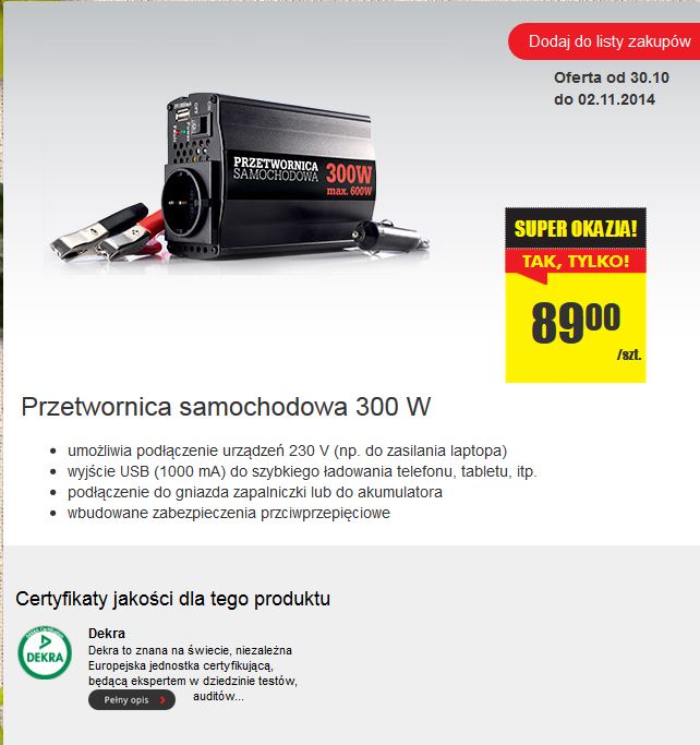 naal pisze:Dostępna jest w chwili obecnej w biedronce przetwornica napięcia 12DC/230AC o mocy 150W (max 350W) z włącznikiem i dodatkowym gniazdem USB. Cena powalająca bo 69,00.