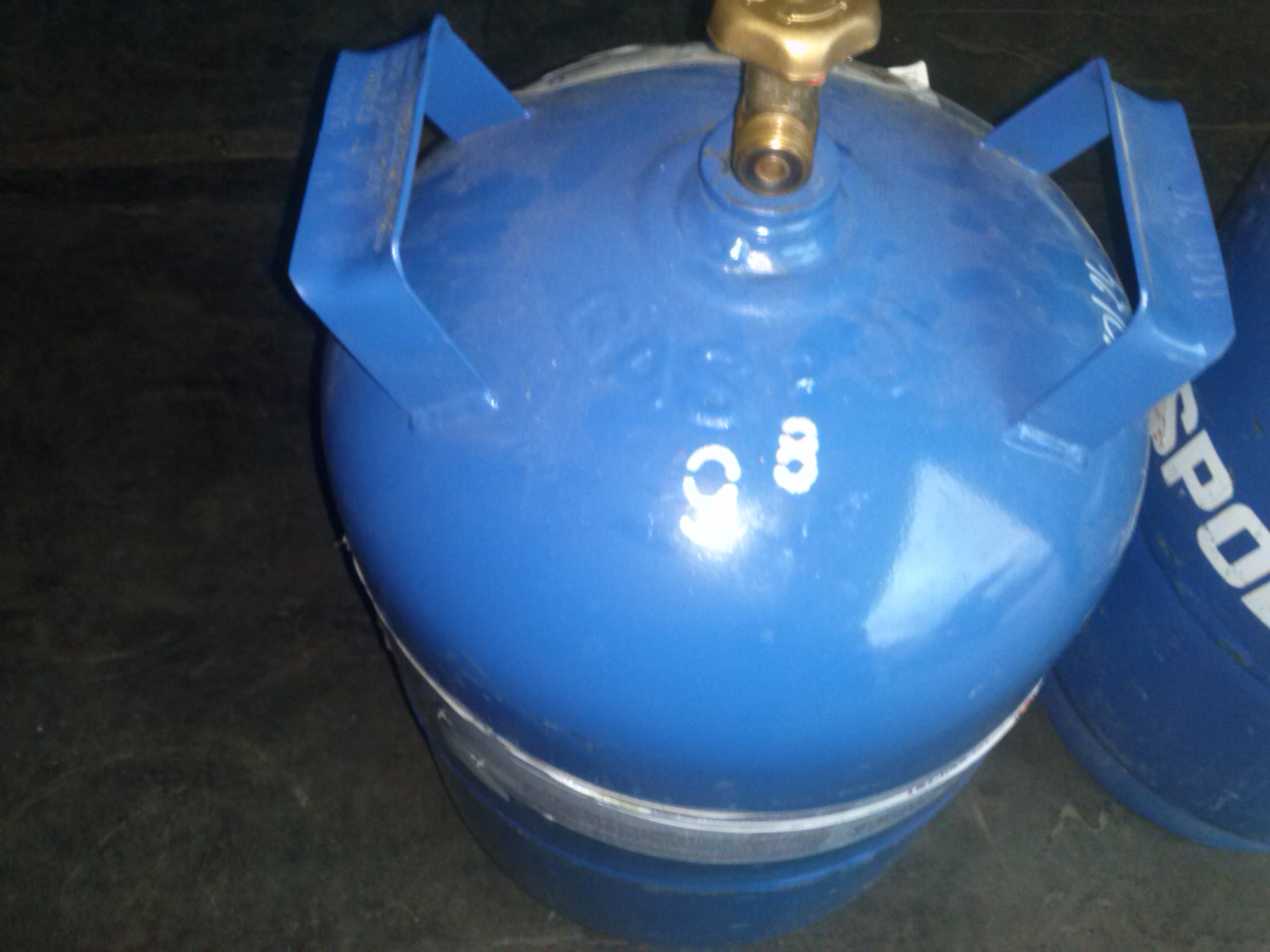 Stalowa butla z kołnierzem pusta waży około 10kg. Nie ma też problemu z zamówieniem czystego propanu w standardowej 11- kilówce (przynajmniej w Sieradzu).