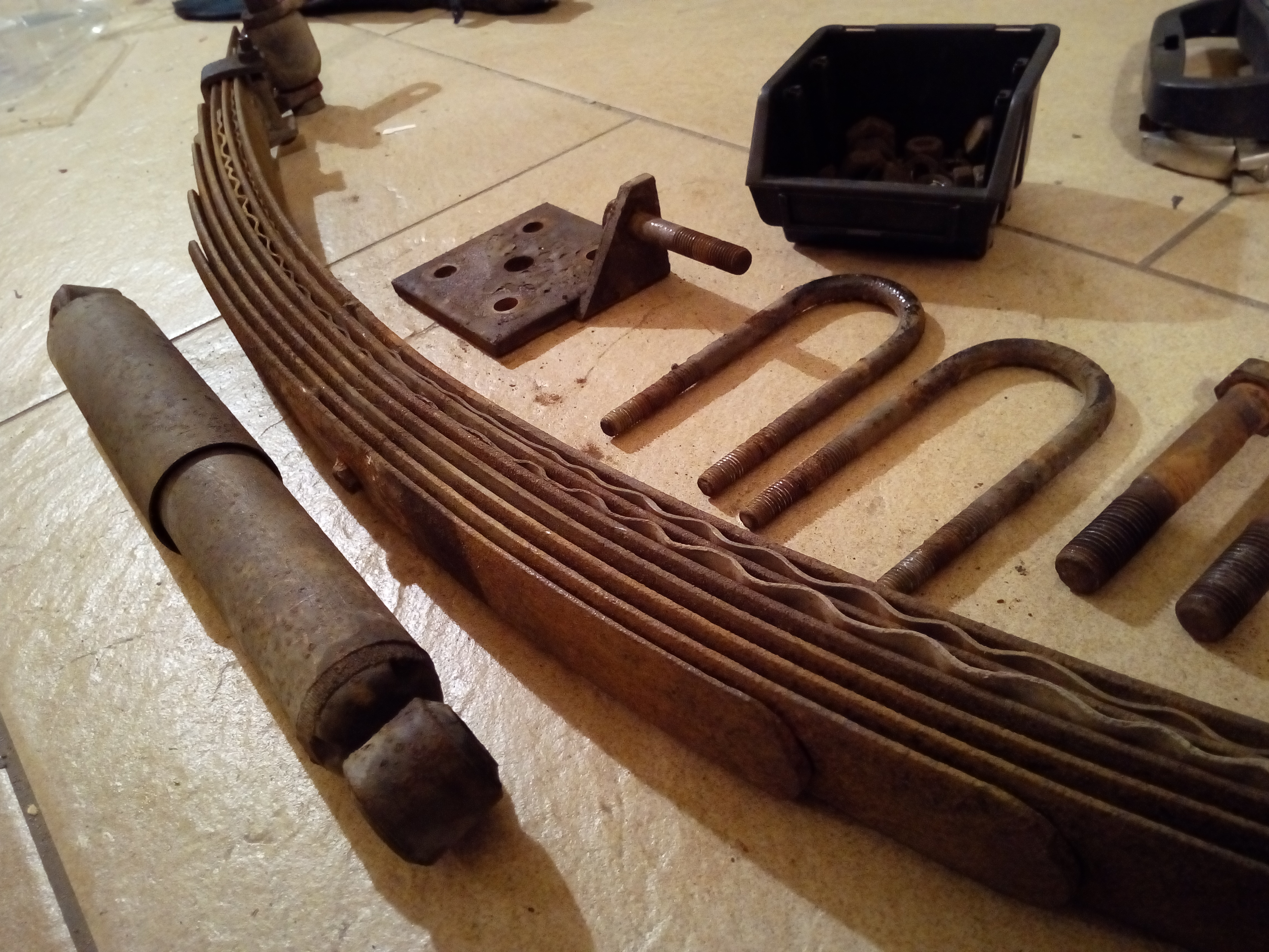 Temperatury za oknem nie sprzyjają już za bardzo wyklejaniu środka, to warto zabrać się za zawieszenie. Teraz tylko poszukiwania pasujących amortyzatorów (obecne nie pracują...) oraz przekładek pomiędzy pióra resorów.