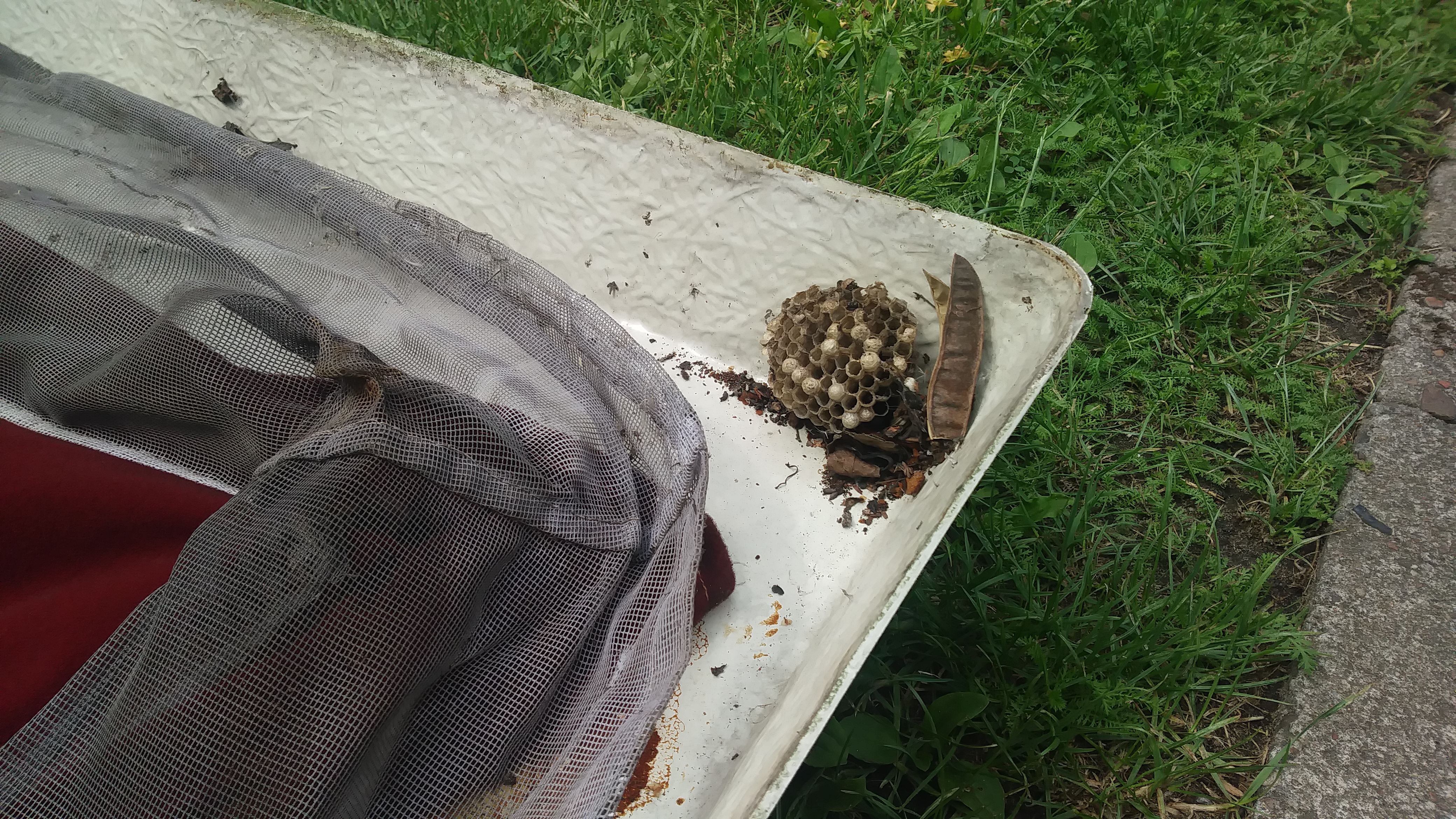 Pierwsza czynność, zdjęcie dachu z dzikimi lokatorami. Okazało się, że były w sumie trzy gniazda os.