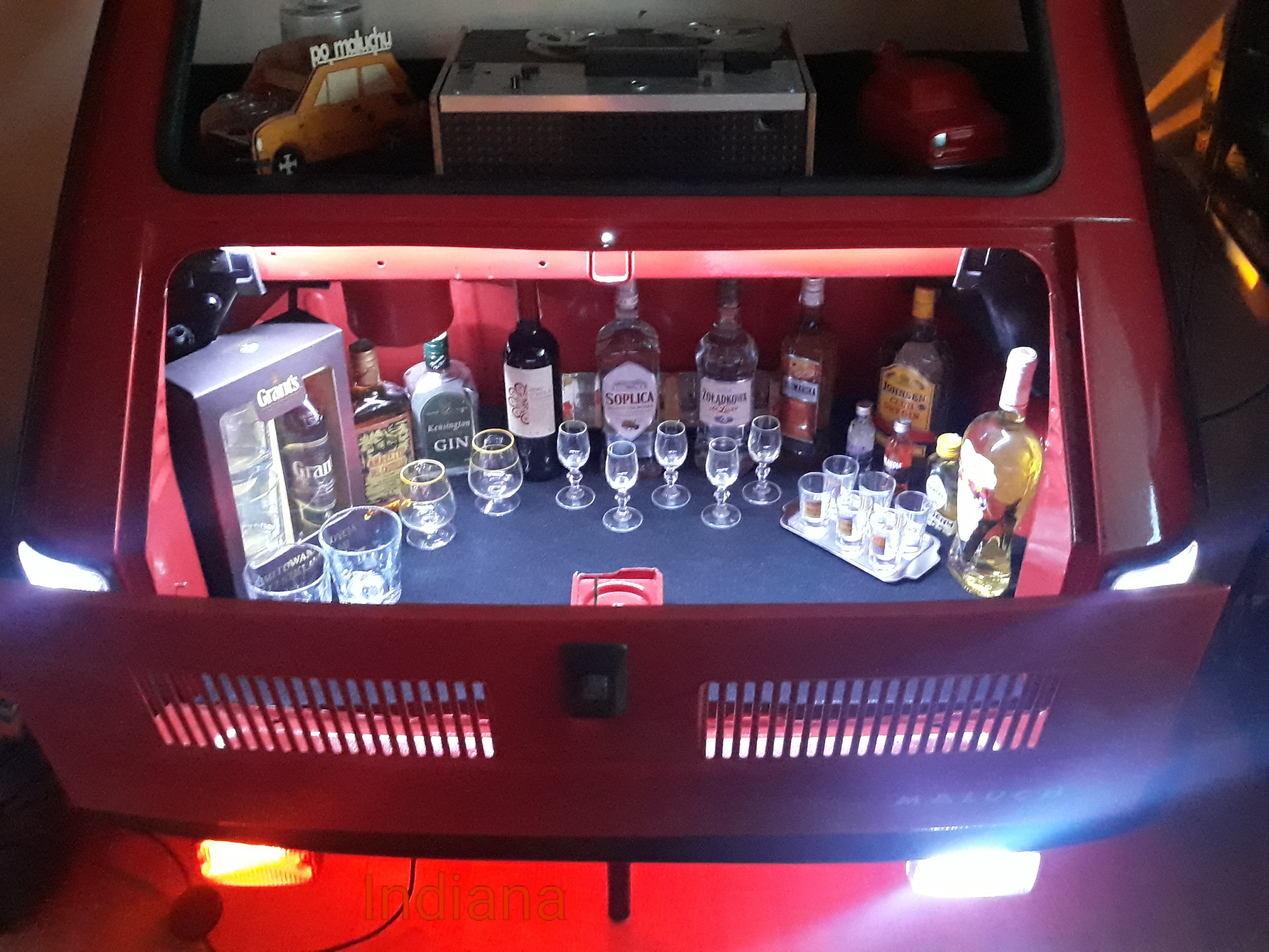 Rok temu powstał projekt pod tytułem pas przedni jako lampka i ozdoba salonu. W tym roku poszedłem krok dalej i powstał projekt barku z tylnej części maluszka. Jest on nieprzypadkowo w kolorze 147 był to wymóg Ani bo jej 126p jest w tym kolorze. Pozdrawiamy