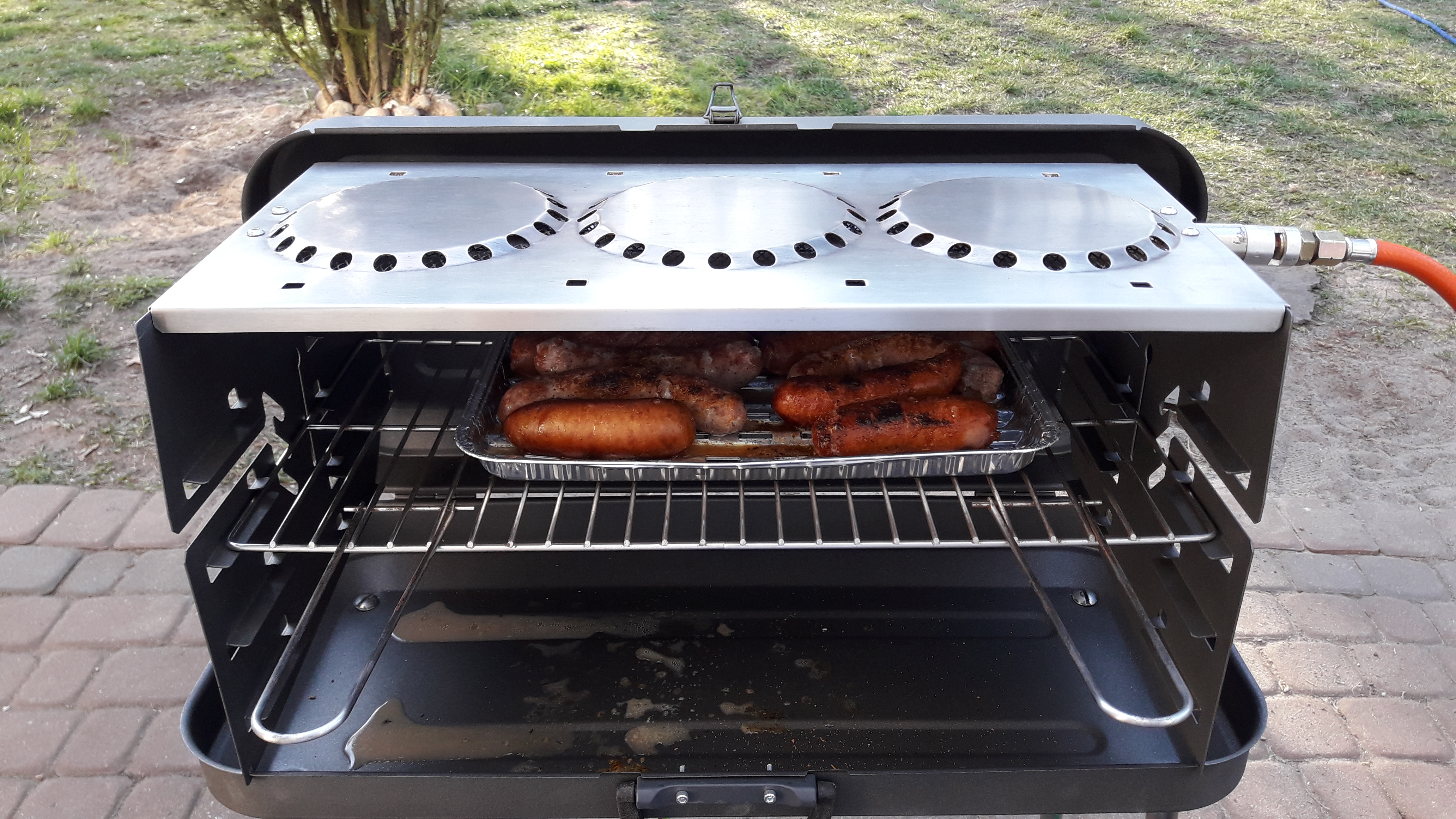 W tej chwili już nie mam pewności, ale znajomy ma takiego grilla albo zwykłą kuchenkę z dodatkową płytą grillową i sobie chwali.