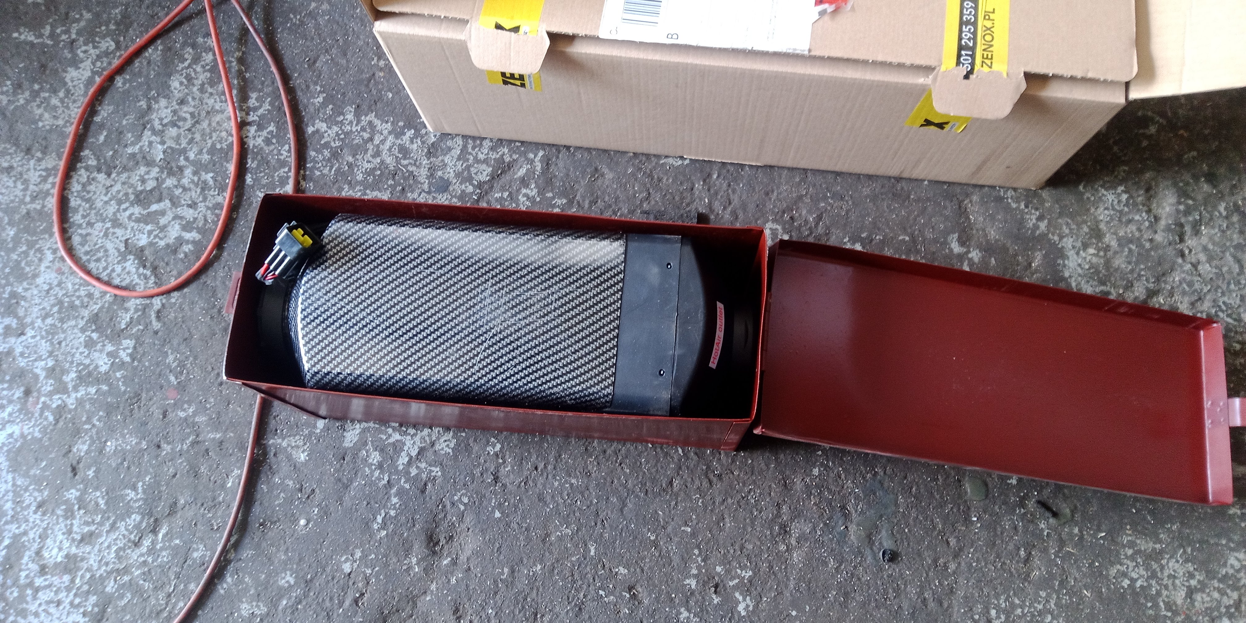 Długo zastanawiałem się gdzie upchnąć chinbasto. Po wielu przymiarkach zdecydowałem się umieścić je pod podłogą auta. Nie chciałem jednak, żeby wylądowało tam bez żadnej obudowy. Ponieważ dedykowane pojemniki na "Webasto" kosztują tyle co całe chinbasto, musiałem znów coś wymyślić. Padło na skrzynkę narzędziową do Ursusa C-360. Okazało się, że chinbasto pasuje idealnie. Po drobnych modyfikacjach, typu wycięcie niezbędnych otworów, skrzynka narzędziowa zmieniła się w obudowę ogrzewania.