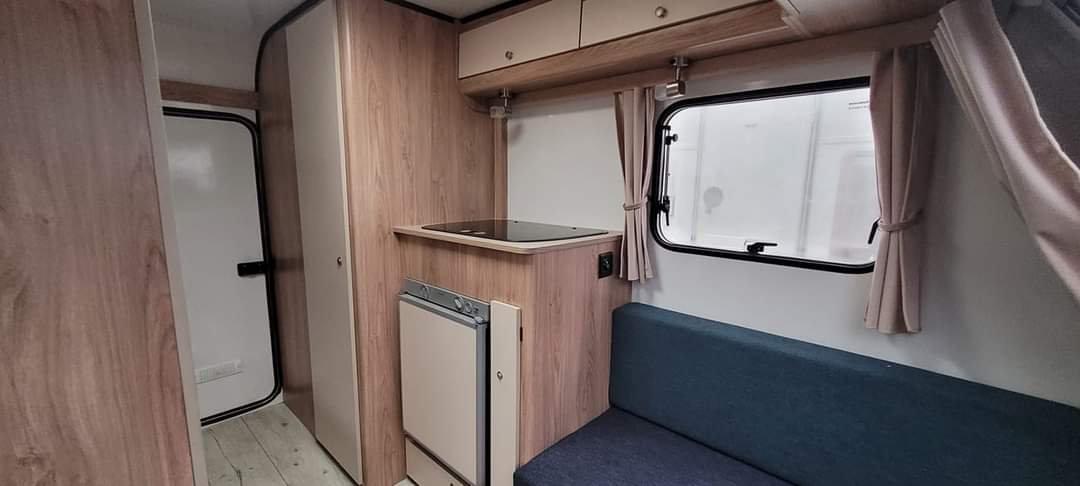 Czteroosobowa, z kuchnią, kibelkiem, szafą i ogrzewaniem Truma.
