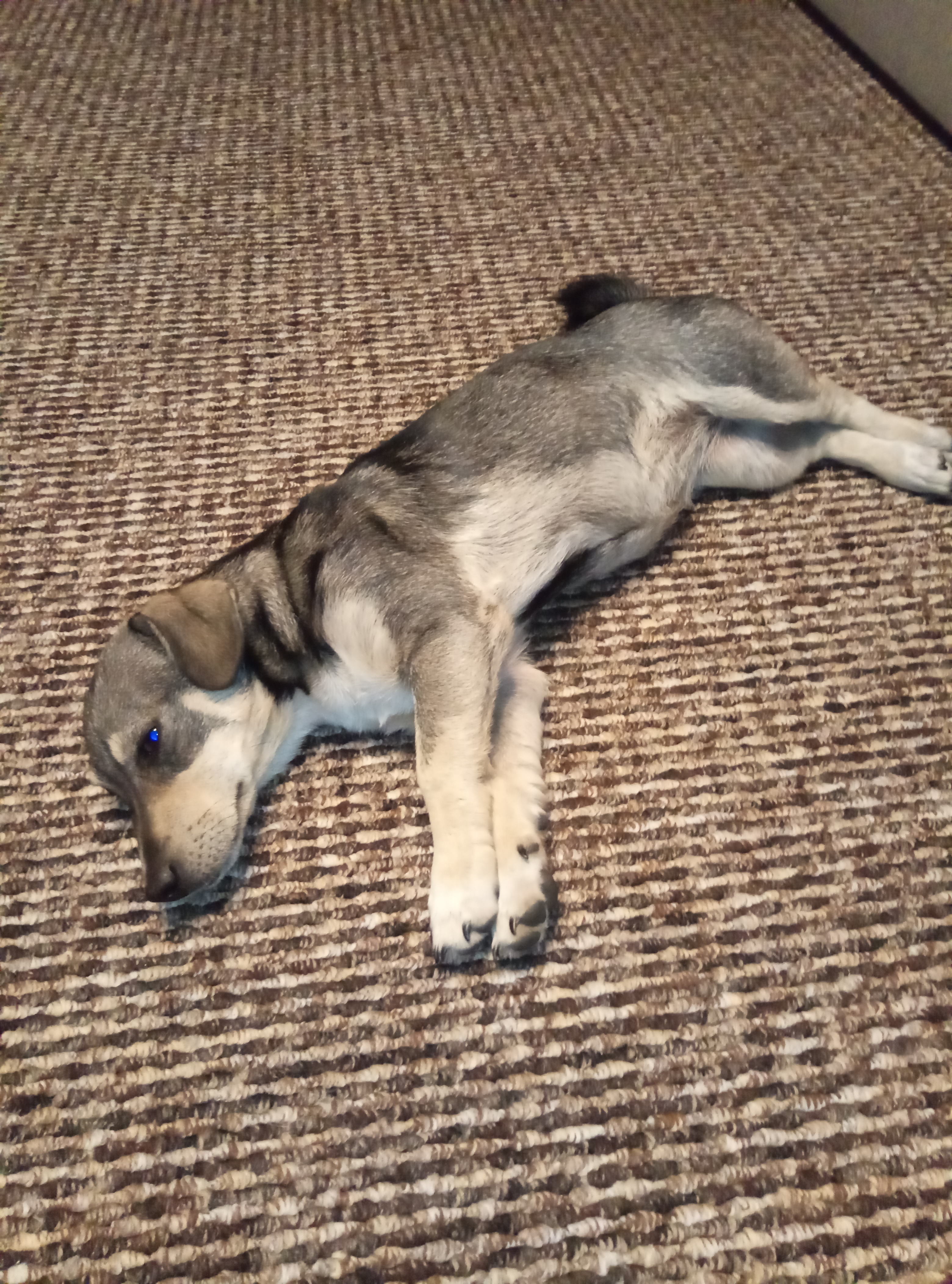 E, tylko śpi. Całe popołudnie poznawała teren. A wieczorem zajarzyła, że są koty.... No i się zmęczyło biedactwo