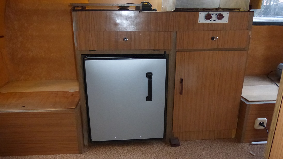 Wodę podłączyłem za pomocą zbrojonego węża igielitowego. Do tego nowa pompka i zaworek zwrotny. Trzeba było przerobić odpływ ze zlewu bo kolidował z lodówką. Na szybko zrobiłem go z plastikowej rurki pół cala i kolanek. Wydawało się, że jest szczelny ale na zapas skleiłem części poxipolem. Podczas wyjazdu odpływ nie zatkał się ani razu ani nie przeciekał więc zostanie tak jak jest. Lodówka ma swoje gniazdo w szafce kuchennej.