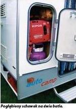 Nie byb schowka re dwie duże butle, co jest dużym mankamentem. Sam go pogłębiłem (był tylko na jedną butlę) sposób, że wchodzą dwie: trzykilogramowa i jedenastokilogramowa - albo w to miejsce wkładam mały agregat. Nie można też bylo wcześniej ładować akumulatora podczas jazdy, bo nie było niezbędnego połączenia(sam akumulator był zresztą bardzo mały, a prostownik nie ten, jaki był potrzebny). Źle wykonana była szafka z lodówką i szufladą, ponieważ cały kurz przedostawał się do szuflady, która nie była oddzielona.Kurz brał się od przestrzeni za lodówką i przedostawał do środka kabiny pod moskitierą okna w kuchni. Między blatem a ścianką była 0,5 cm przerwy, przez którą także przedostawał się kurz i zimno.