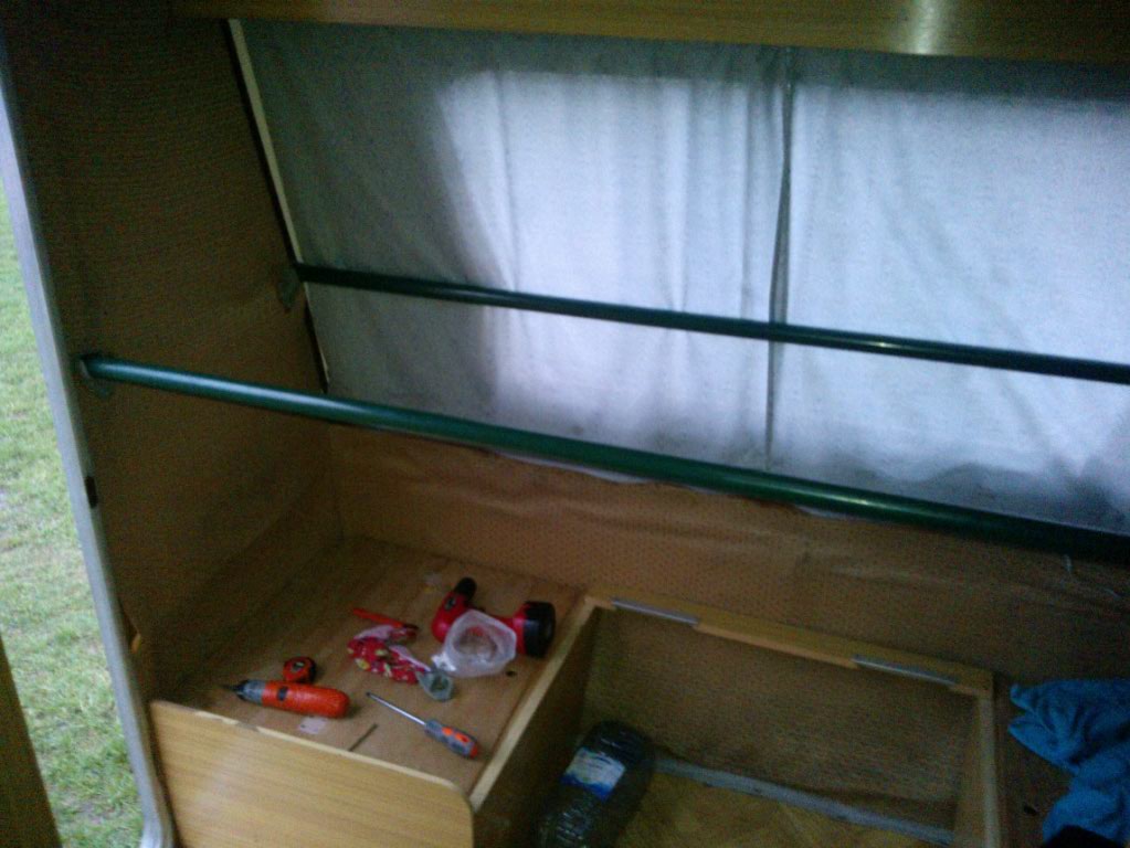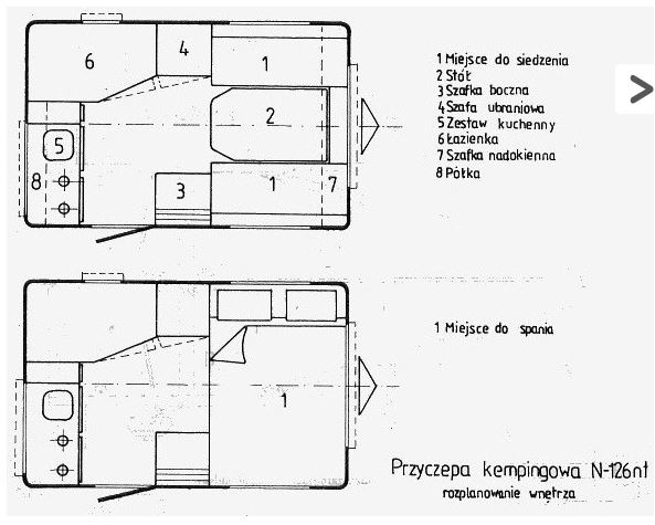 Plan mam taki: w miejsce kuchni chce zamontować prysznic z podnoszoną umywalką do tego małe przenośne wc. Szafa ubraniowa została by przerobiona na szafkę kuchenną bez zlewu, z górnym miejscem na mikrofalę. Nad tylną częścią przyczepy składane łóżko coś w rodzaju pryczy jaka stosowana jest w ciężarówkach, tak aby po podniesieniu można byłoby swobodnie siedzieć.