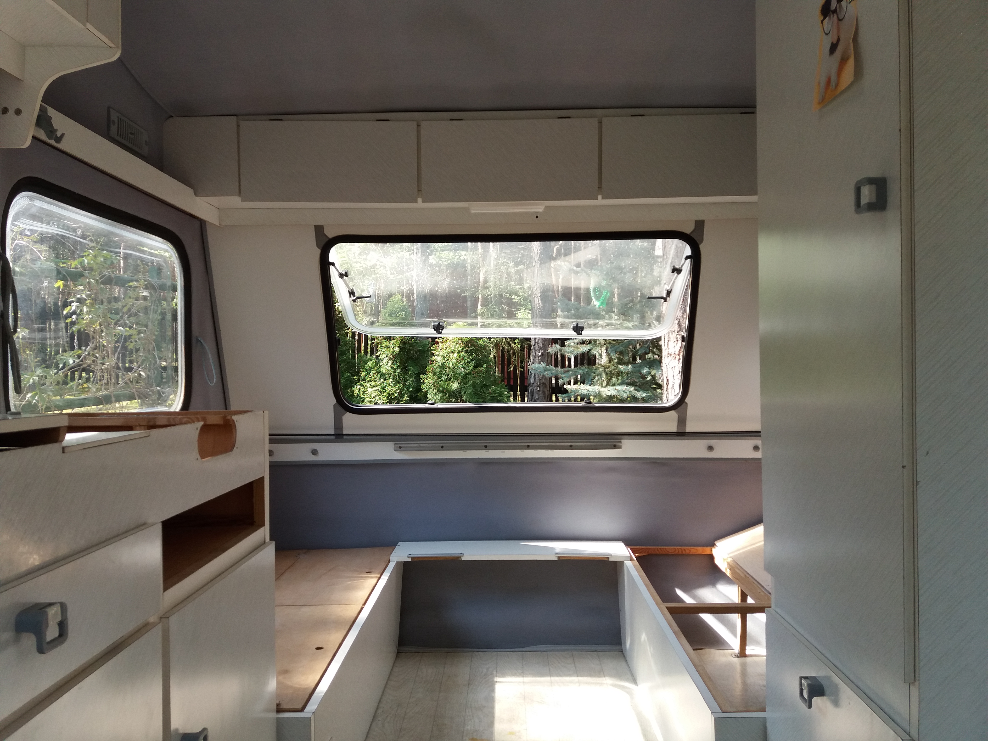 Teraz wpuszczę tu elektryka, żeby zrobił wszystko tak jak w moich pomysłach, bo poprzedni właściciel nic nie przerabiał, a światła wewnątrz świecą tylko po podpięciu do samochodu. No i od razu wyjście światła na zewnątrz, radio samochodowe + głośniki do środka. I pewnie sprzątanie od nowa