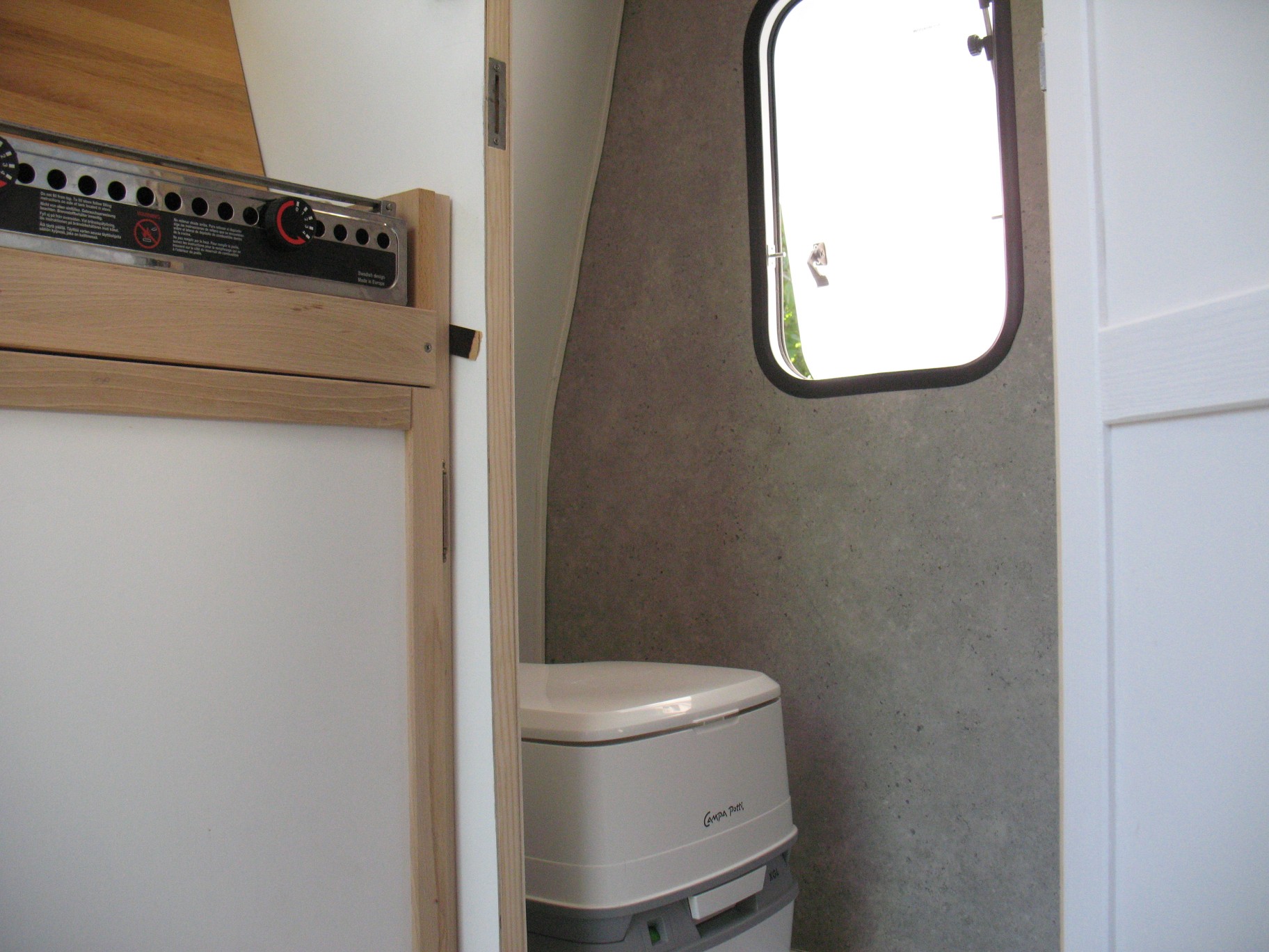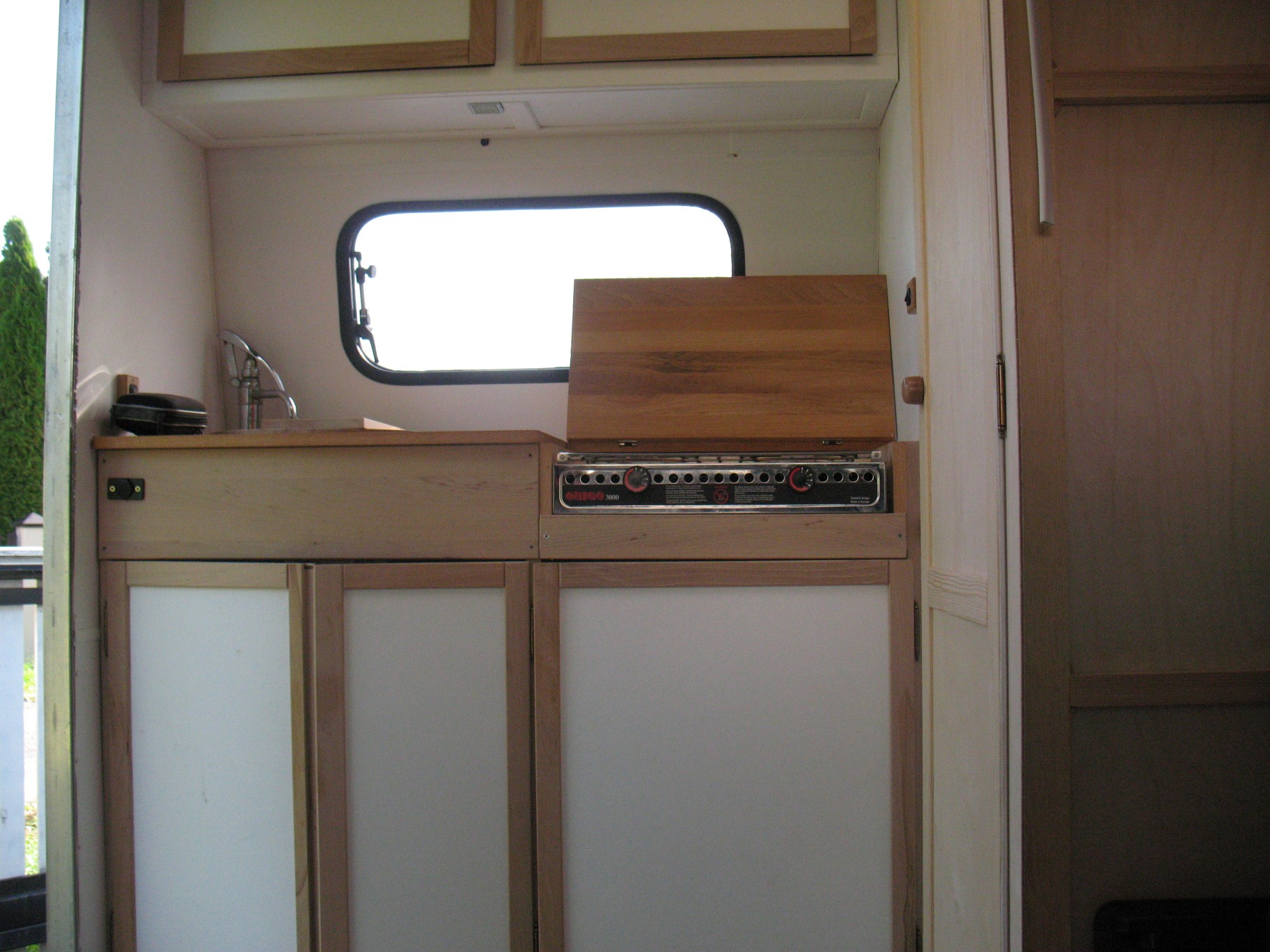 Uzyskanie niezależności energetycznej polegało na instalacji panelu pv 100W, ładującego akumulator 100 Ah poprzez regulator MPPT, gotowanie posiłków powierzyłem kuchence Origo 3000 na spirytus (nie poważam gazu) zaś woda do zlewu pochodzi z 10 litrowego baniaczka pod nim, a do prysznica - z ok. 30 litrowego zbiornika na dachu. Szara woda odprowadzana jest do rury fi 160 umieszczonej za osią.