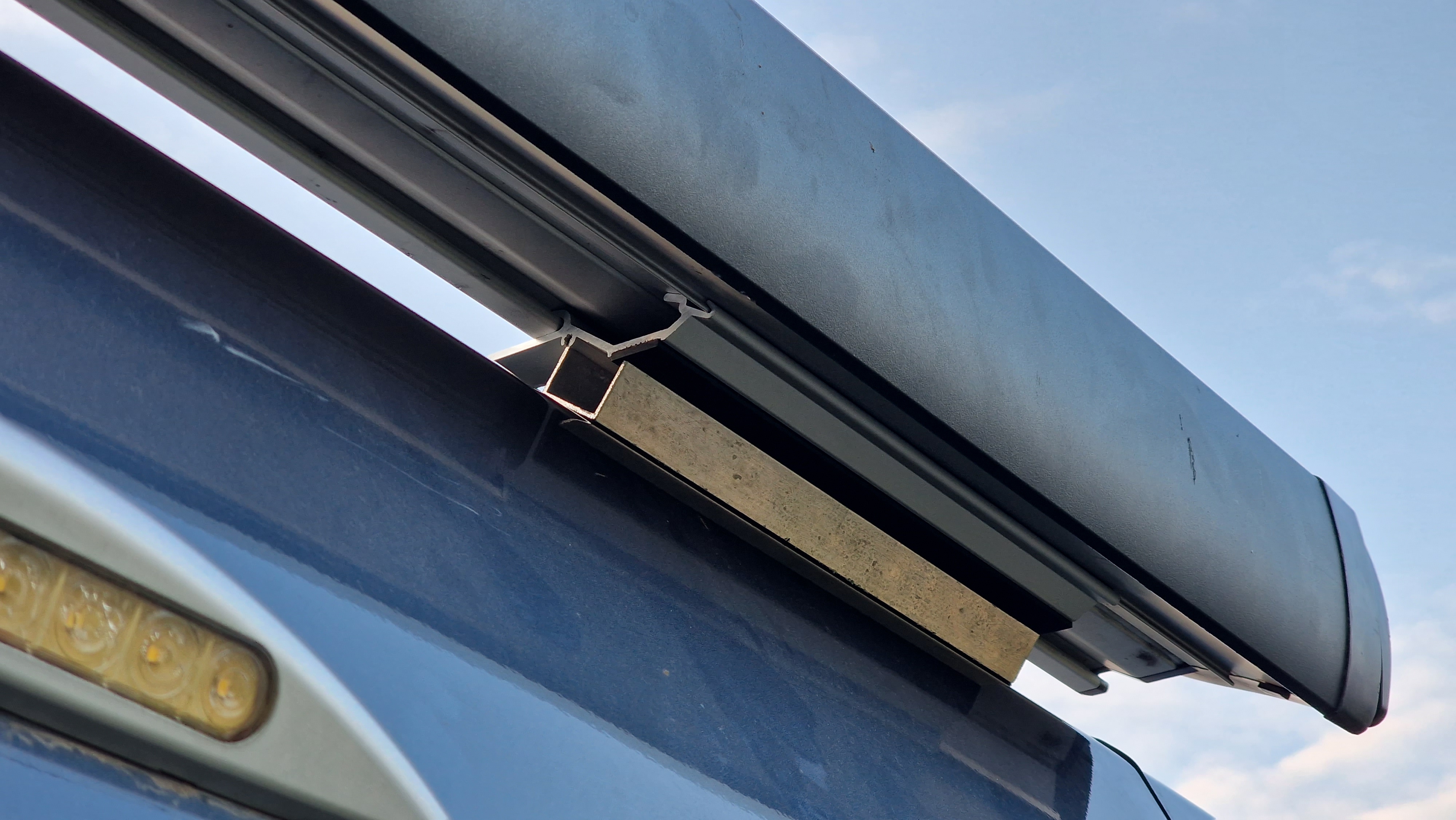 Rozejrzałem się po garażu i znalazłem ceownik aluminiowy i starą dętkę od taczki, które idealnie rozwiązały mój problem. Jedyny minus to, że markiza odstaje, a nie leży idealnie na dachu.