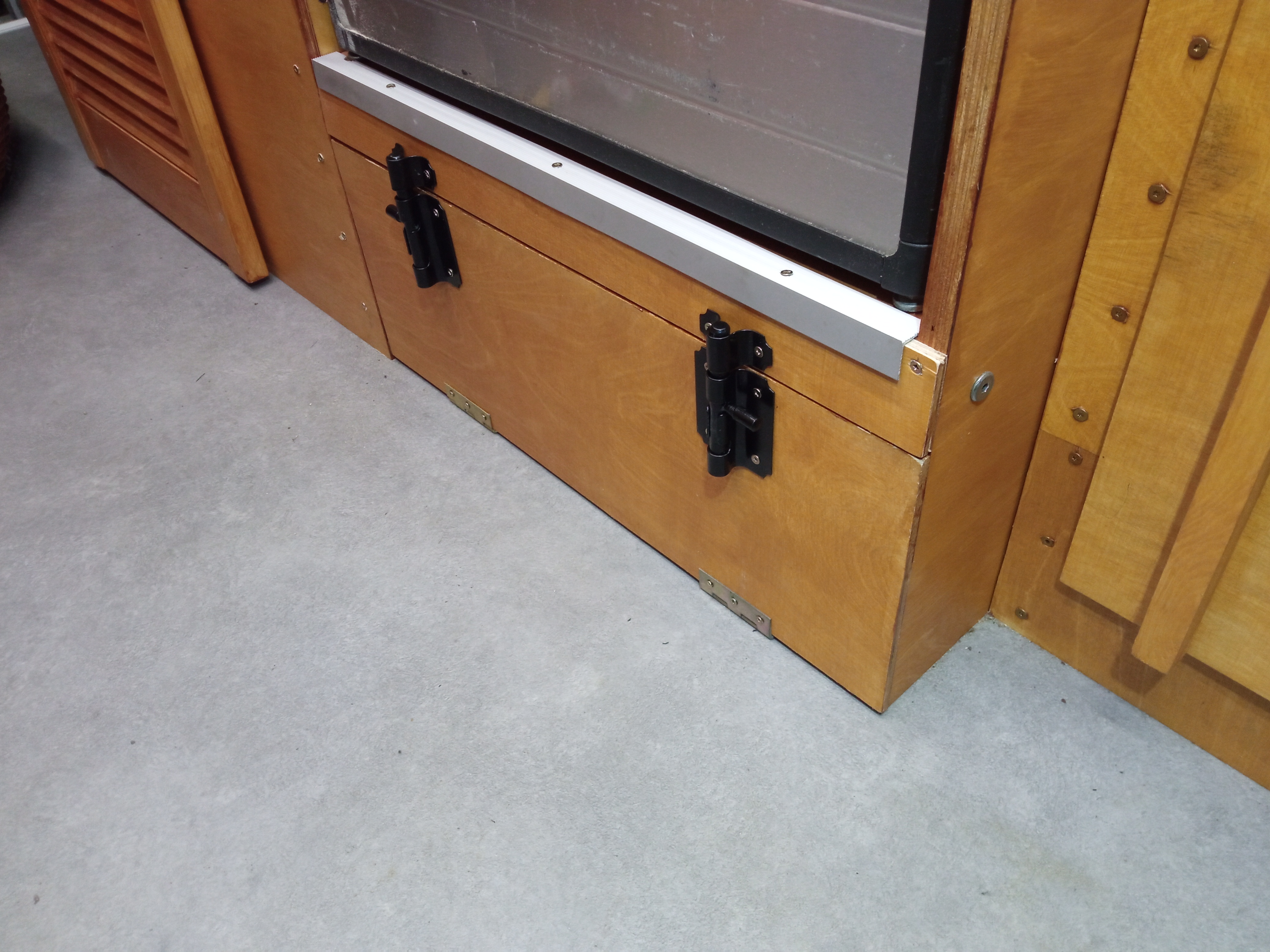 Kolejne usprawnienie, które "wyszło w życiu". W aneksie kuchennym, pod lodówką mamy spory schowek, którego wykorzystania na etapie budowy aneksu jeszcze nie znaliśmy na 100%. Powstał jako efekt uboczny niezbędnego podniesienia lodówki. W praktyce, dobrze pasuje na przewożenie zapasu wody butelkowanej. Dotychczas był otwarty, więc siłą rzeczy woda wypadała