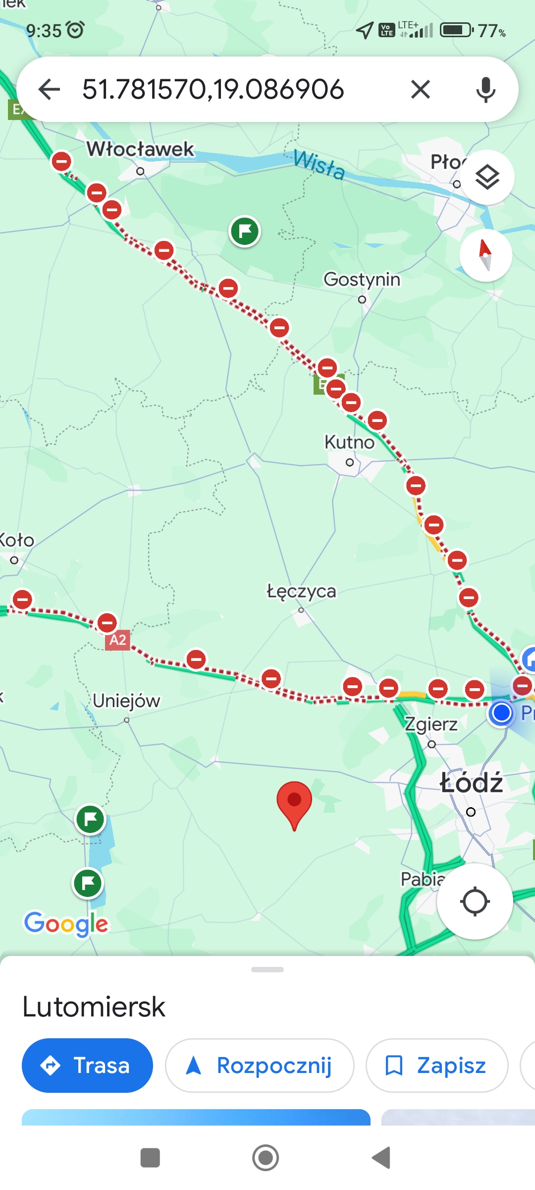 A2 od Strykowa do wysokości Koła zablokowana ( wyjątkiem jest krótki odcinek pomiędzy zjazdami Zgierz a Emilią gdzie ruch odbywa się normalnie