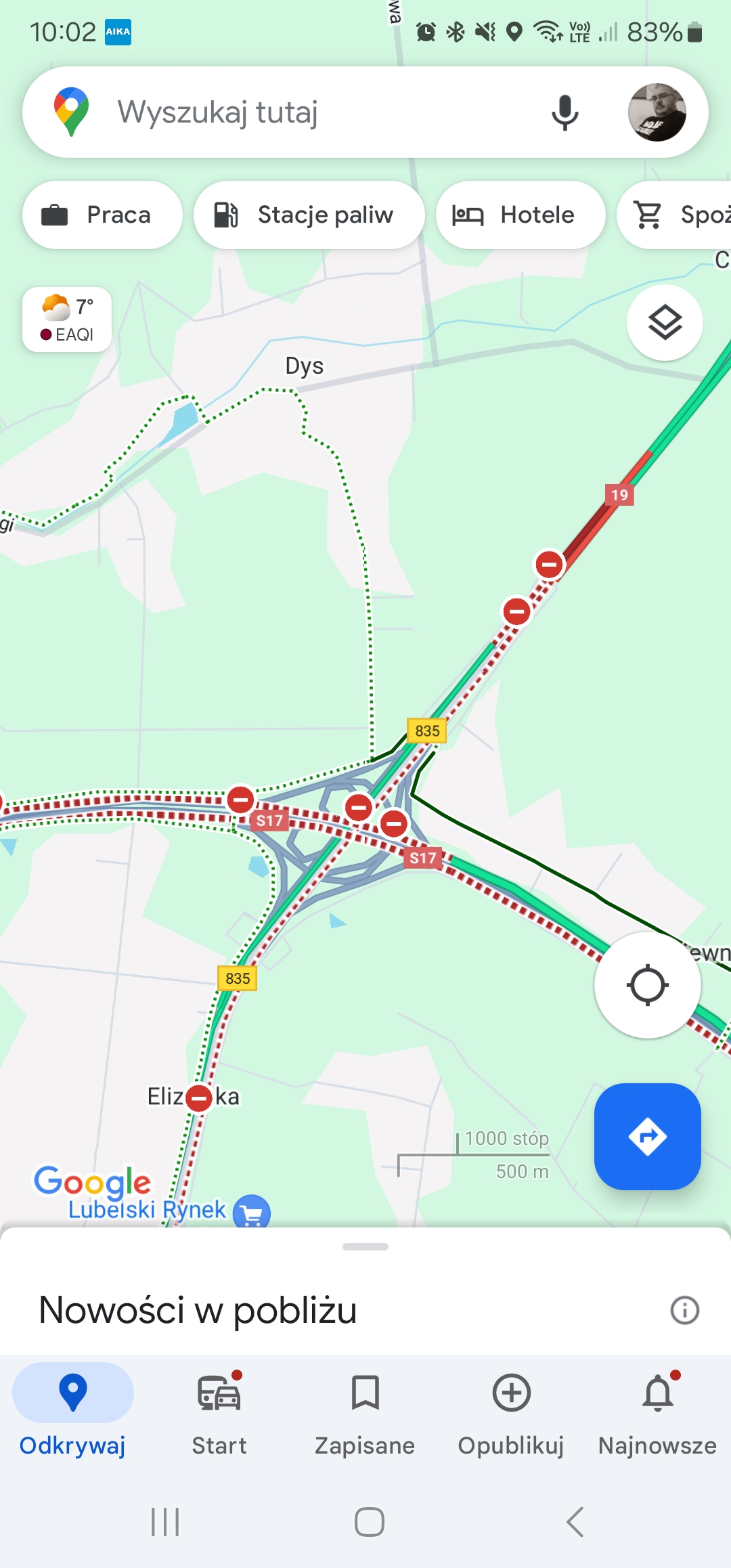Mnie dziś koleżanka pytała o dojazd z Sandomierza do Lublina. Jak sprawdzałem to Google ładnie omijało blokady prowadząc częściowo starą 19, ale dla pewności i tak poleciłem jej bardziej alternatywną trasę.