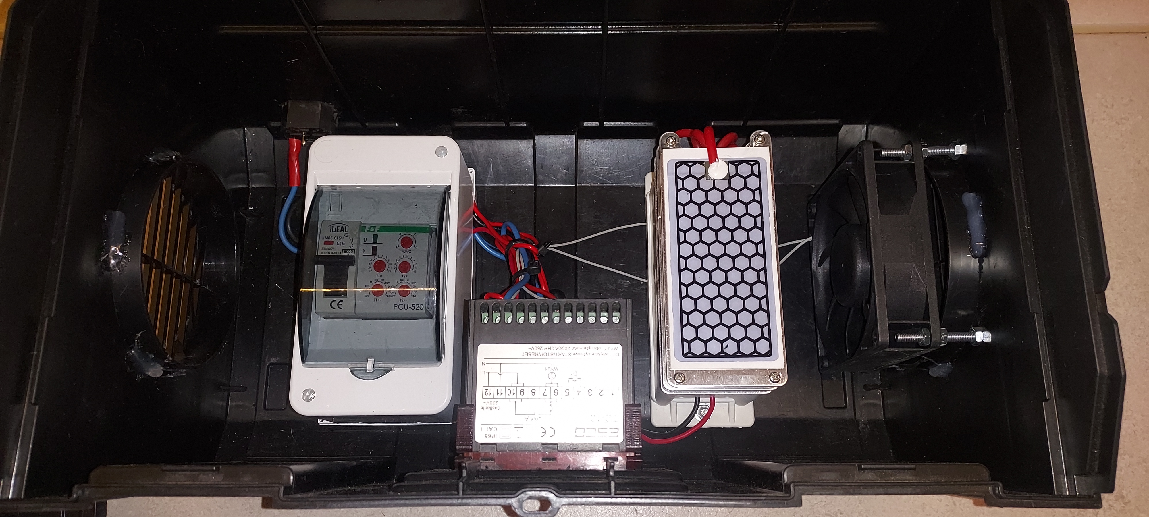 Kupiłem to samo co Konrad, ale przyoszczędziłem na wiatrakach (z odzysku). Chodzą co prawda na 12V, ale wleciał też mały zasilacz. Wisienka na torcie to przełącznik. Hula aż miło. Pierwsze testy zrobione na łazience. Bubu nie lubi zapachu ozonu :D