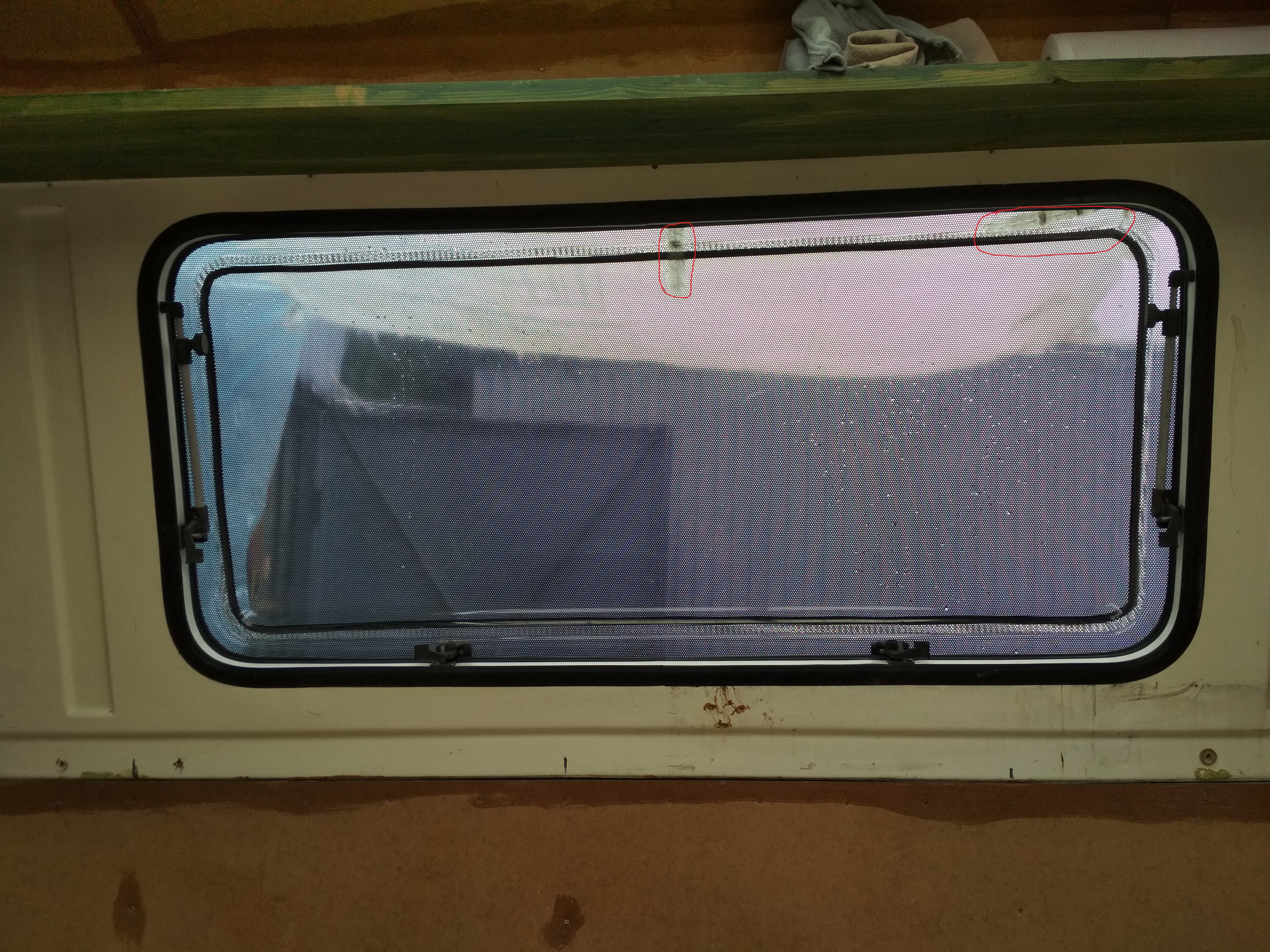 Zakreśliłem w kółka miejsca (przyczyny dlaczego zdecydowałem się oklejać szyby) gdzie ją zszyłem zszywkami na gorąco.
