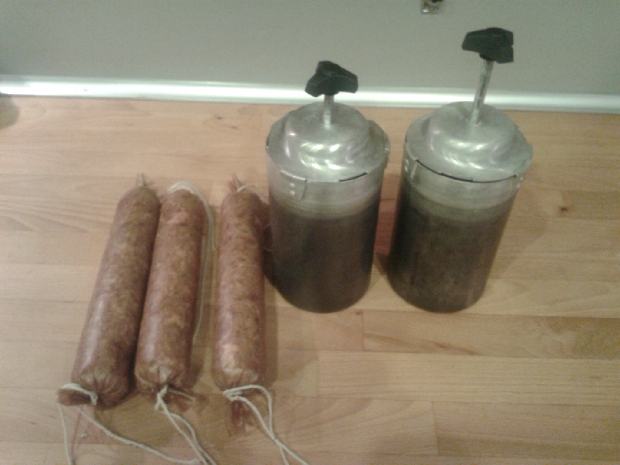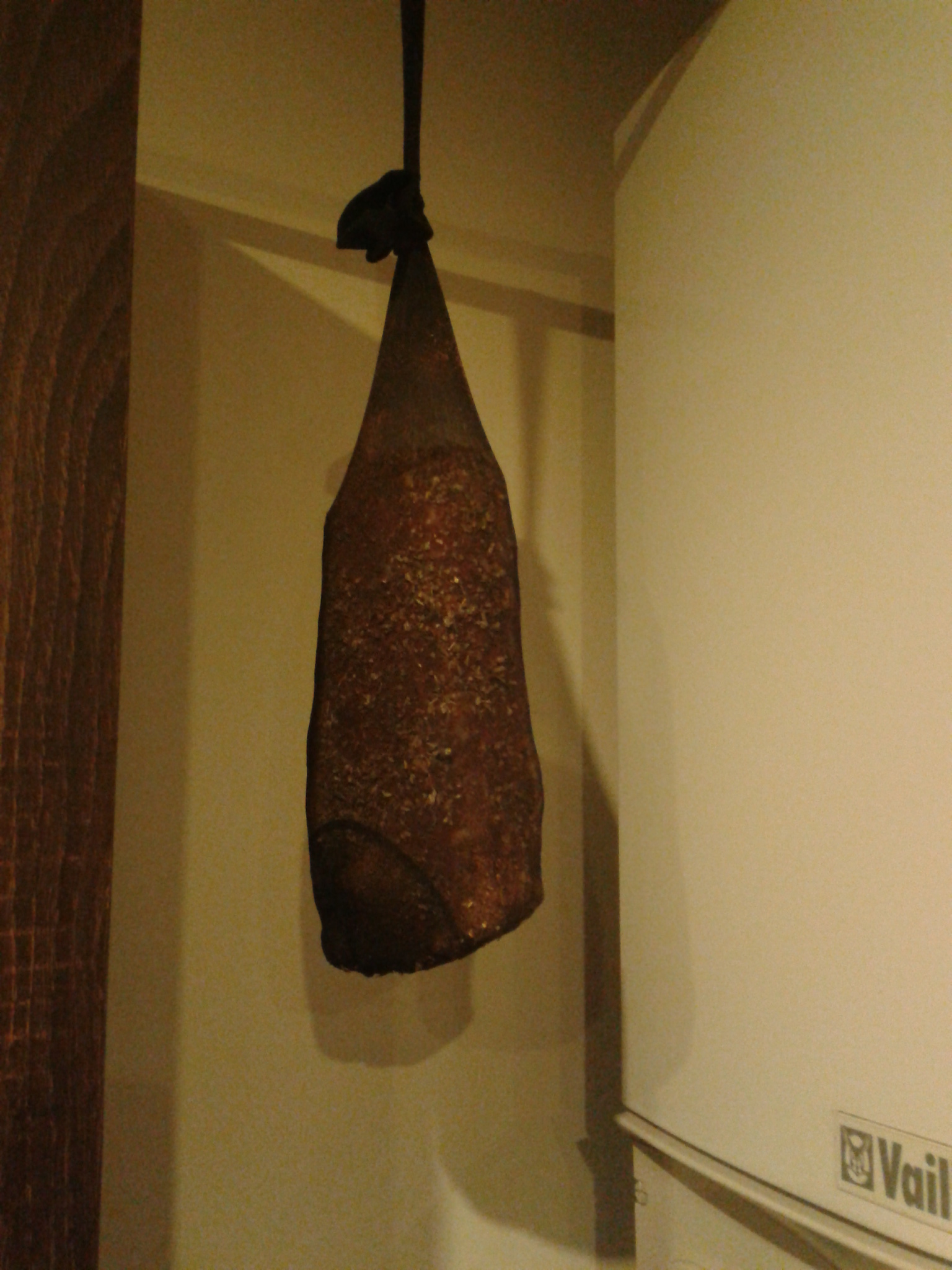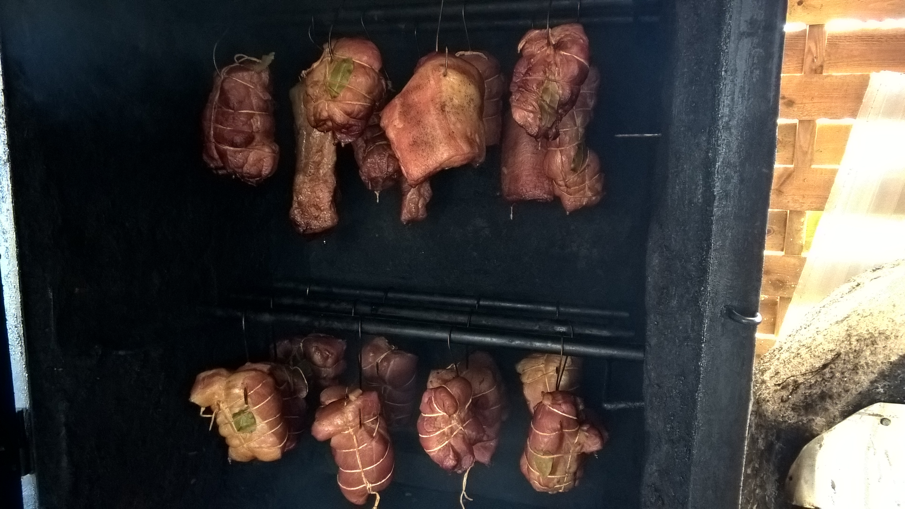 U nas dzisiaj nocka w niewiadce i nocne zadymianie wędlinek. Pierwszy raz w takich ilościach. Do tego w domu dojrzewa schab. Jeden w siatce i drugi w gazie dla porównania.