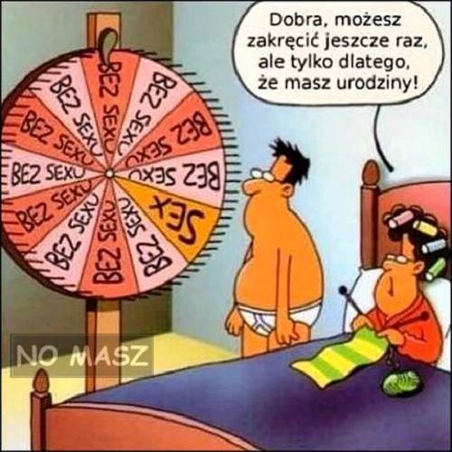 Janek już porządnie zdenerwowany odwraca się, cmoka żonę w policzek i z powrotem na drugi boczek.