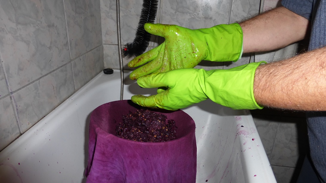 Do tej pieluchy polecam duży, biały lejek z Biowinu z wkładanym sitkiem. Super sprawa, to co zlałem do balonów jest elegancko przefiltrowane, dotychczas tak mi się nie udawało. Do tego owoce ekstra wyciśnięte, prawie jak na prasie do owoców. Zostały wytłoczyny w kształcie dość suchych kulek, porcji z pieluchy. Idealne żeby zrobić nastaw na grappę :D i puścić to potem na rurki. Tylko nie mam sprzętu...