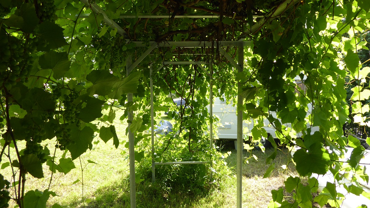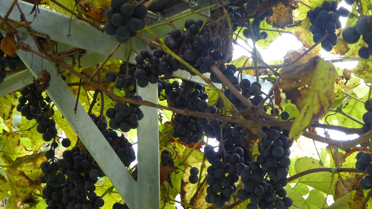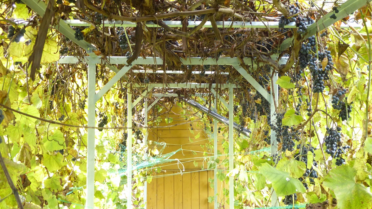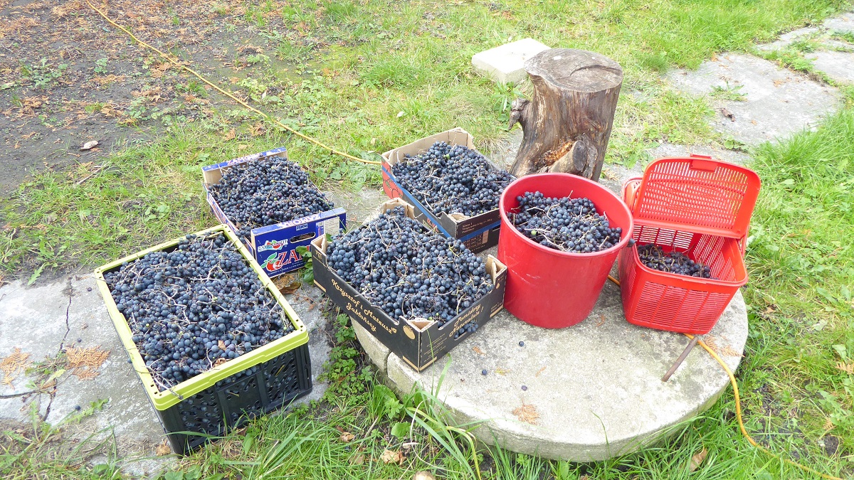 Winogrona już zebrane i przerobione, bąbelkują wesoło w piwnicy a ubiegłoroczny nastaw trafił do butelek. W tym sezonie dwie nowości. Pierwsza to pergola którą zmajstrowałem na wiosnę bo stara się posypała. Konstrukcja sprawdziła się świetnie a zbiór z niej to była przyjemność. Udało się dobrać właściwą dla wygody wysokość i po raz pierwszy cały towar zebrałem z ziemi i... stopnia do przyczepy a nie jak w ubiegłych latach z drabiny co było mega upierdliwe.
