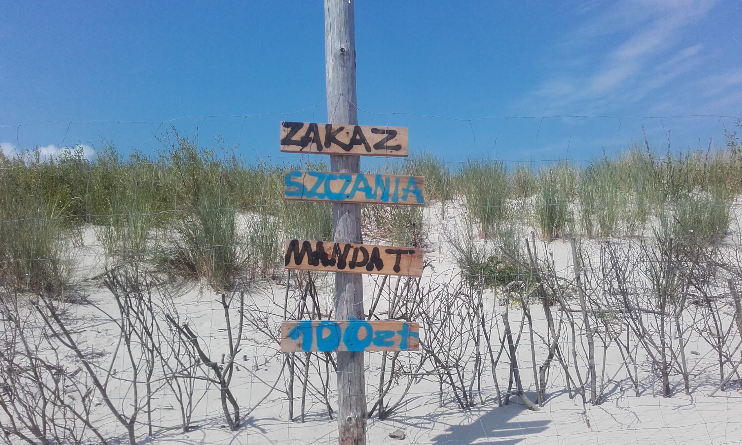 Tablica informacyjna na plaży helskiej od strony bałtyku.