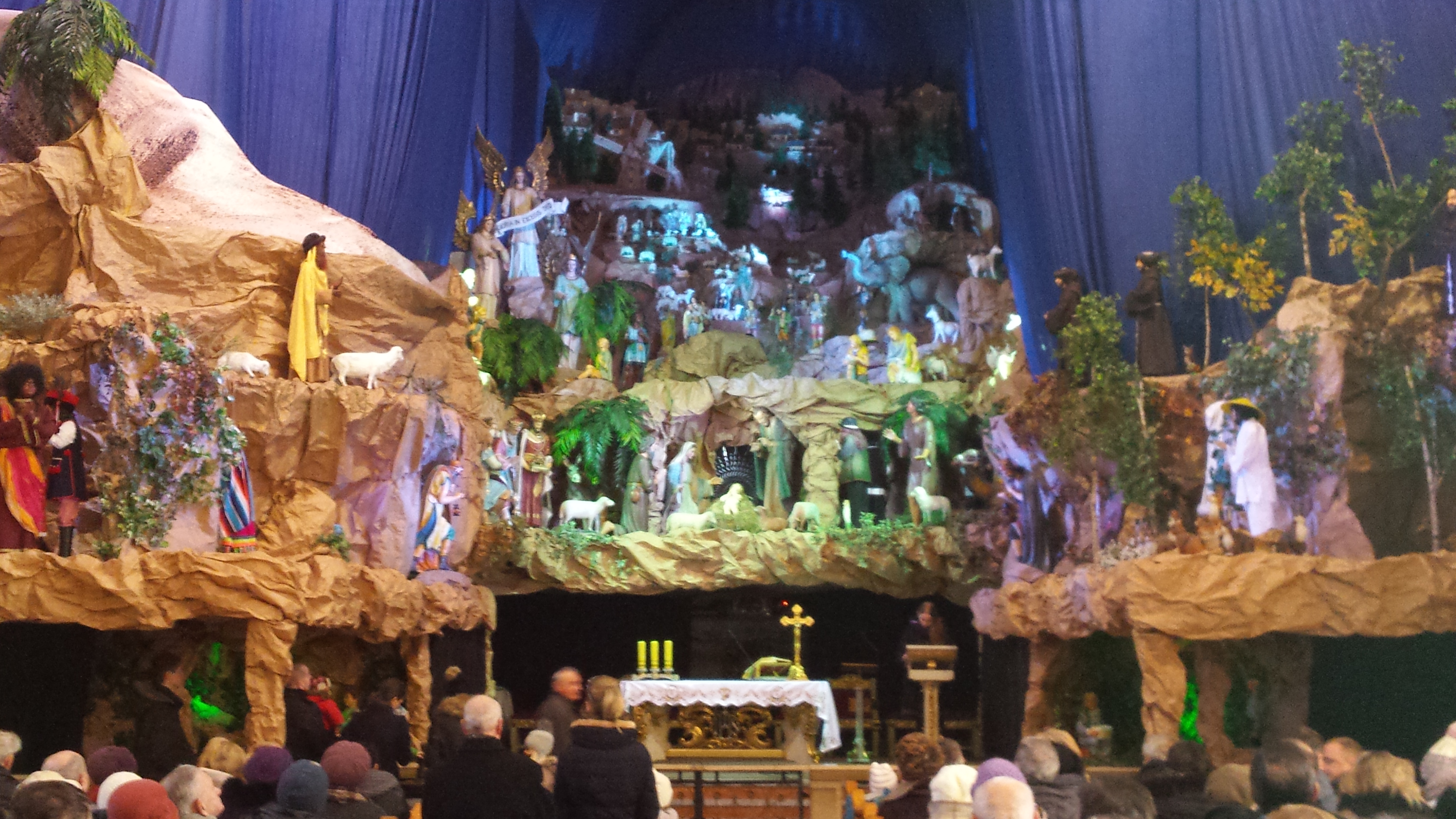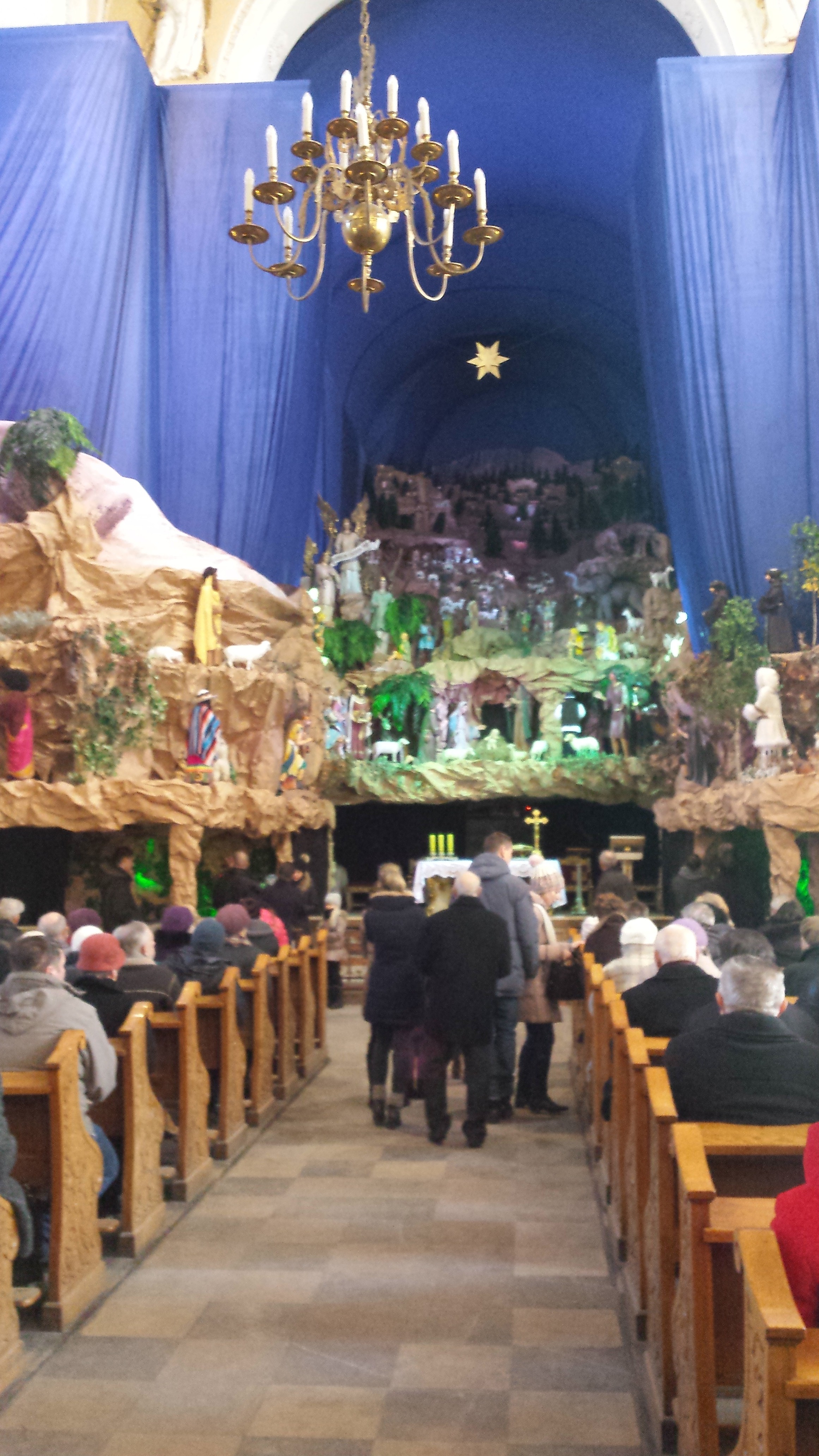 żłobek w kościele Bernardynów . Chodzące postacie , zwierzęta , śpiew ptaków głosy zwierząt wysoki na około 15 metrów