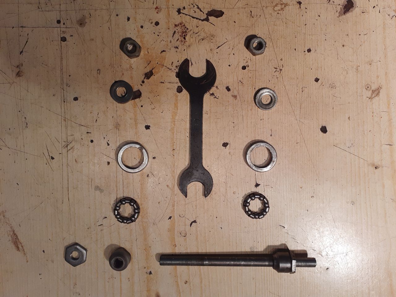 Na pierwszy ogień poszły piasty - mycie, smarowanie i regulacja. Przy okazji znalazłem w gratach oryginalny klucz ZZR do konusów. Łańcuch wyszejkowany w benzynie i nasmarowany oliwką do łańcuchów.