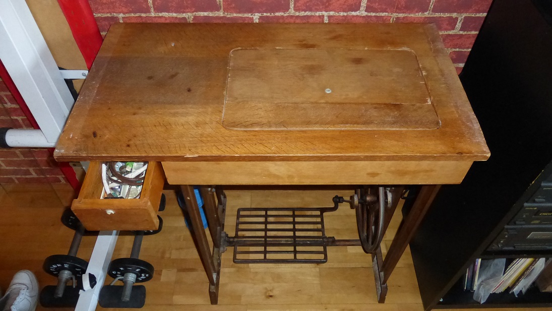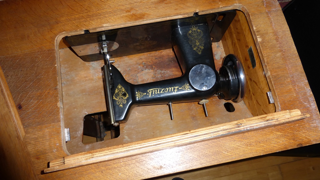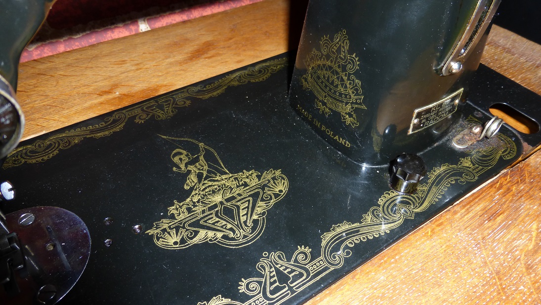 W takiej pozycji maszyna jest przechowywana pod blatem. Widać otwór w który wkłada się rękę żeby unieść blat i zdemontować. Mniejsza część pokrywy jest na zawiasie a większą montuje się po lewej stronie głównego blatu żeby go przedłużyć. Sprytne rozwiązanie. Widać też grafikę, której nie musiało być bo krawcowa i tak nie widzi tylnej strony maszyny. Widać, dbali o szczegóły