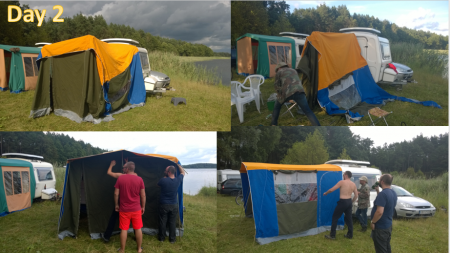 Potem okazało się że przedsionek nie ma kedry. Było to spore zaskoczenie, ale "podobno takie przedsionki są, co się je naciąga na bok przyczepy i ściąga sznurkiem". No dobra jak są to są. Nie wiem czy faktycznie takie są, ale jak są to autora patentu należałoby powiesić za jaja. W każdym razie po długiej walce z rurkami udało się założyć przedsionek, i nawet sypialnię. Wszystko super, duży przedsionek z 3 wejściami, z sypialnią...