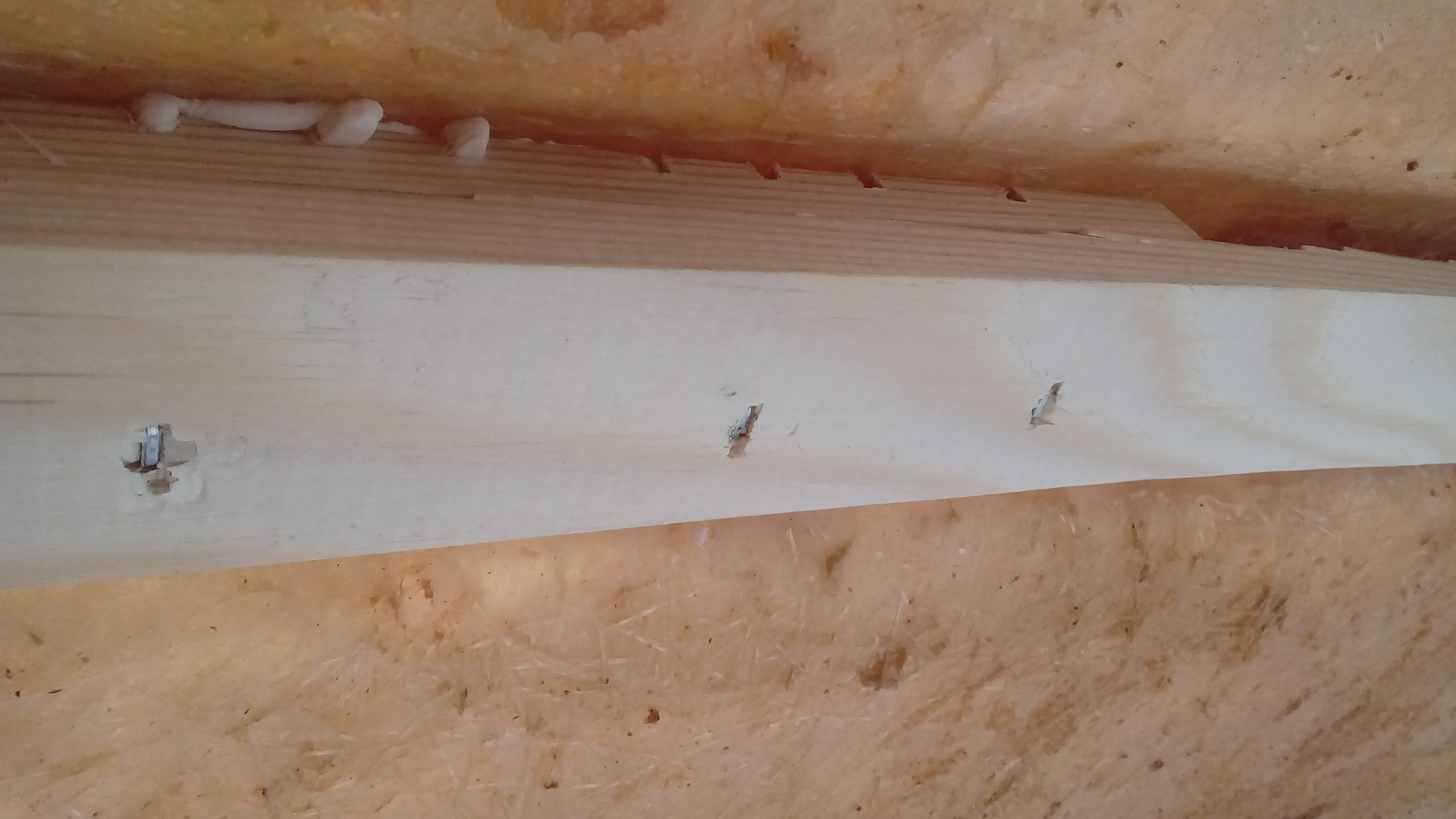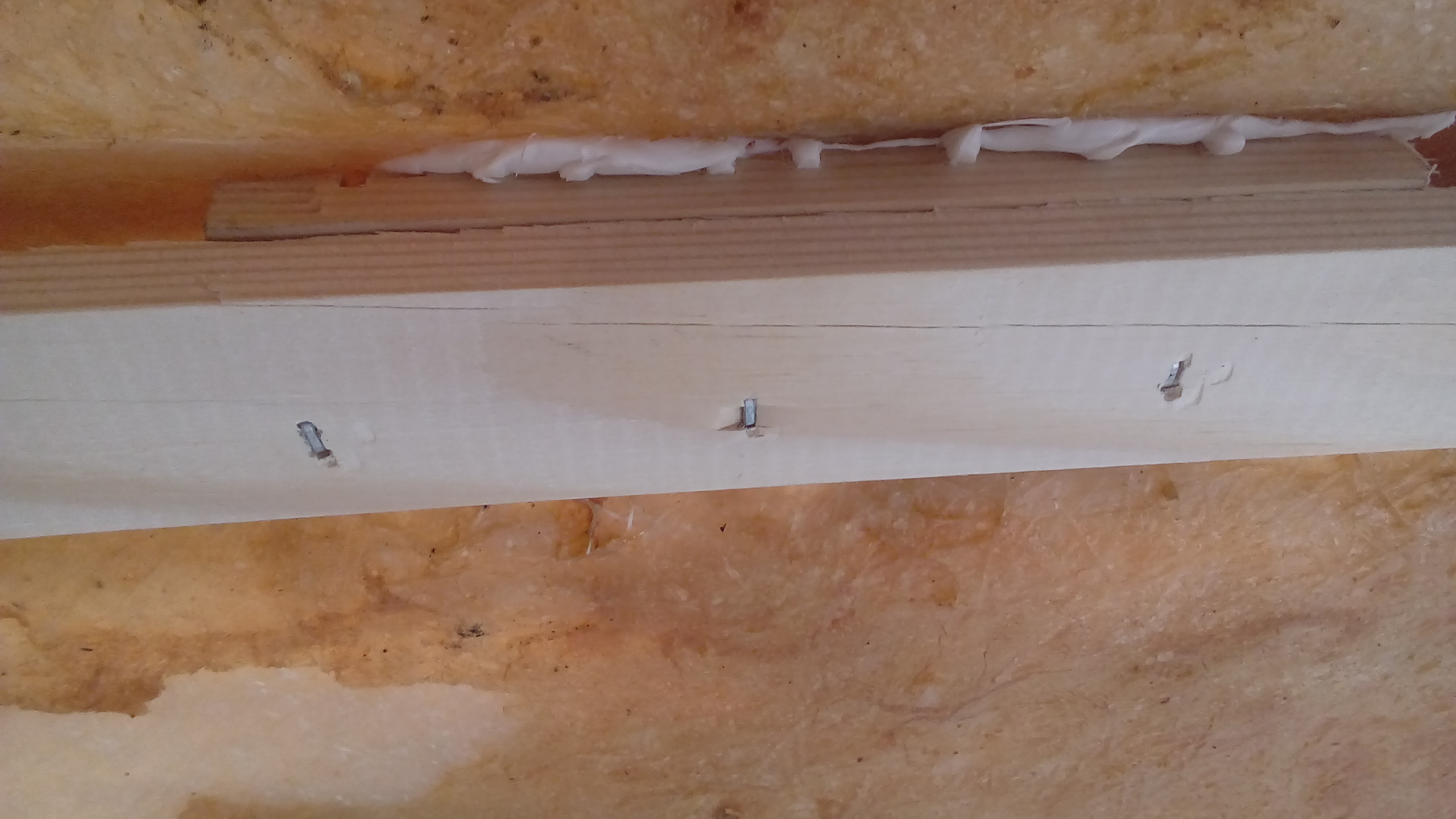 Listwy drewniane wklejone w sufit i zalaminowane. Wcześniej zostały przytwierdzone sztyftami przy pomocy pistoletu pneumatycznego. Po sztyftach nie poprawisz