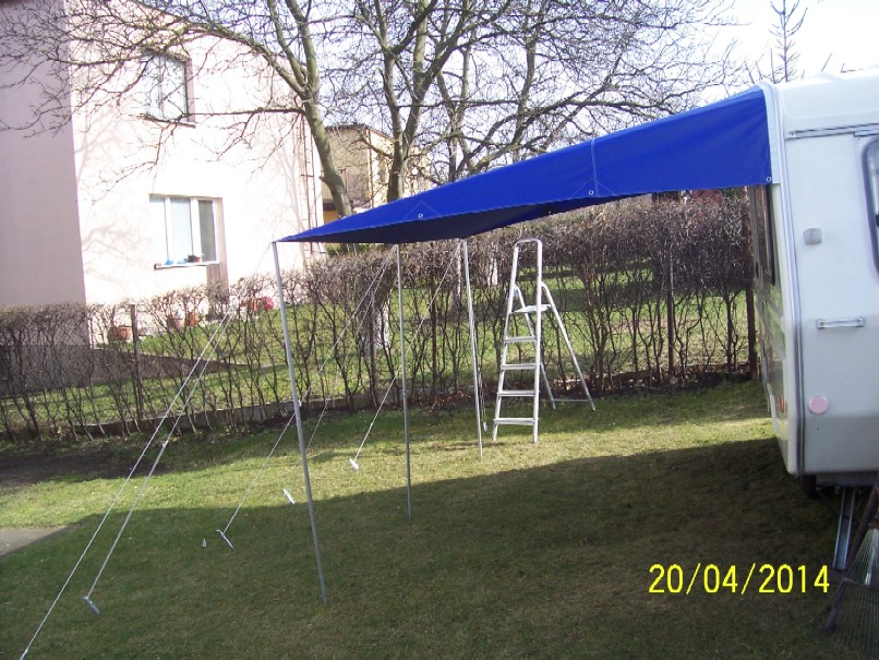 Przestało padać to założyłem niedbale daszek p. słoneczno-deszczowy w/g mojej opinii doskonale się sprawdzi zarówno w ciepłych krajach jak i na krótkich postojach w naszym klimacie ( nieprzemakalny ) zaleta to błyskawiczny montaż , leciutkie aluminiowe rurki możliwość dopięcia bocznych osłonek ( po 4 remizki na bok ) i wszędzie można go schować .Przepraszam za datę zdjęć o miesiąc do przodu