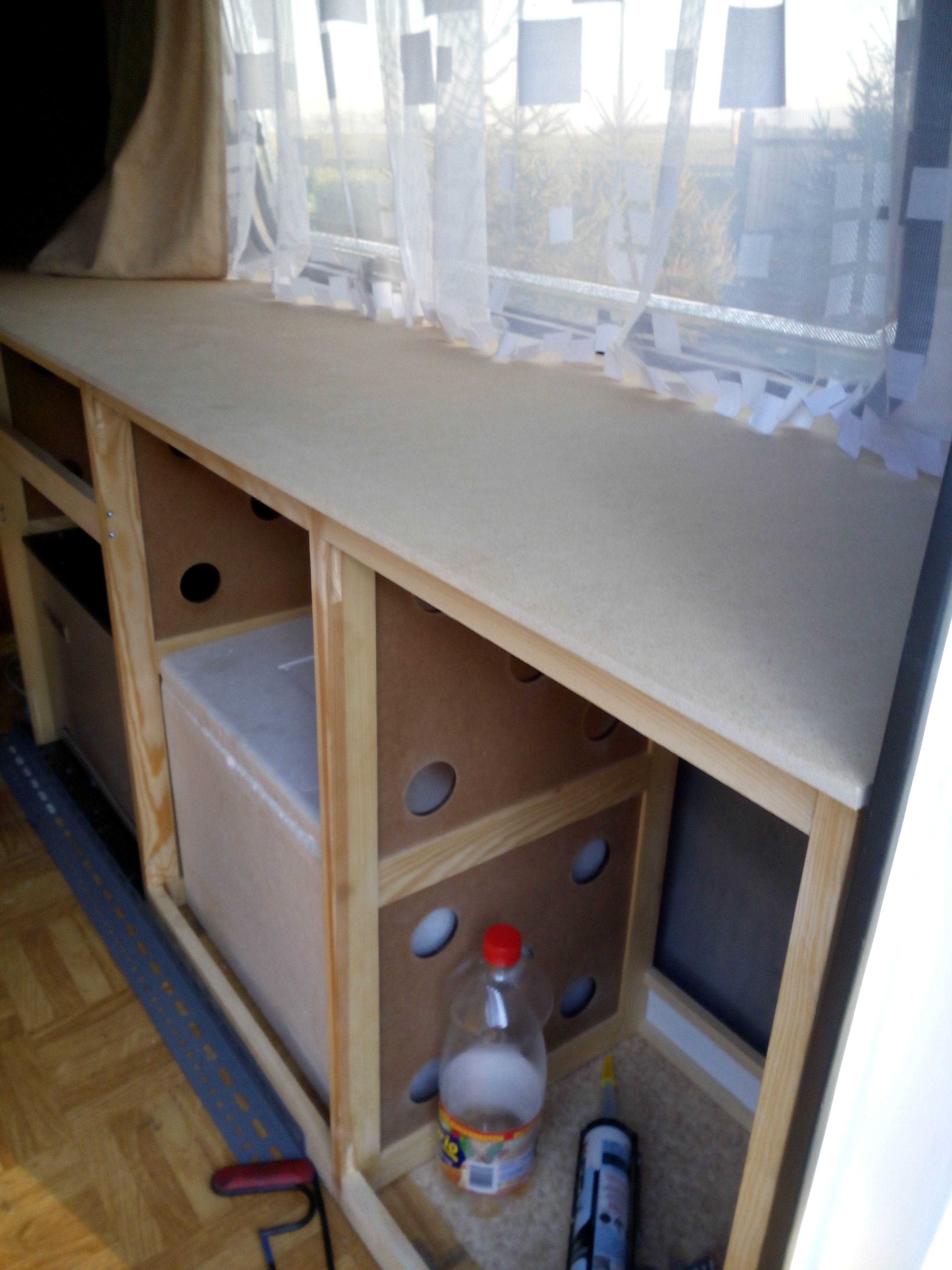 Wszędzie jest dostęp do wszystkiego i każdy następny właściciel będzie mógł to zrobić sam. Meble będą na całej szerokości przodu przyczepy. Zostanie tylko łóżko dla dwojga osób z tyłu. Będzie też osłona na nadkole ze schowkiem służąca jako siedzisko a w nocy będzie służyła jako nocny stolik przy łóżku.