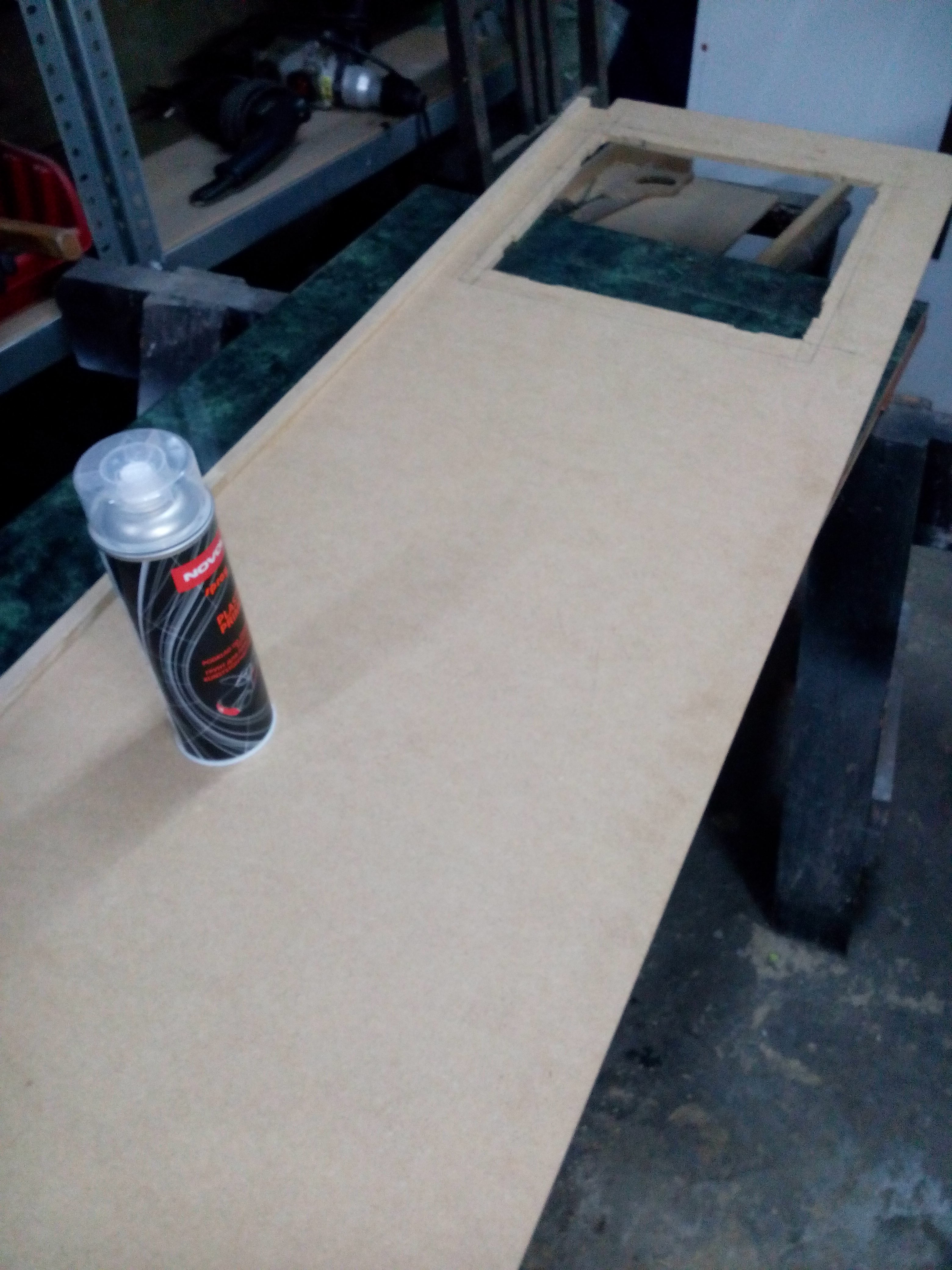 Koszt blatu to 22 zł, został zainpregnowany od spodu specjalnym środkiem penetrującym i w miejscu zlewu oraz zbiornika wody, od spodu dodatkowo pokryty akrylem ( podkład samochodowy ) Powierzchnia blatu pokryta będzie okleiną przy użyciu opalarki ( wytrzymałość folii samochodowej, którą okleja się karoserie ) Blat został docięty z płyty MDF gr 8 mm długości 188 cm i szerokości 48 cm, wzmocniony od przodu doklejonym paskiem MDF o gr 10 mm i szerokości 1,5 cm co daje nam równe 18 mm grubości ( grubość płyty meblowej ) zastosuje maskownice na kant blatu jak do mebli.