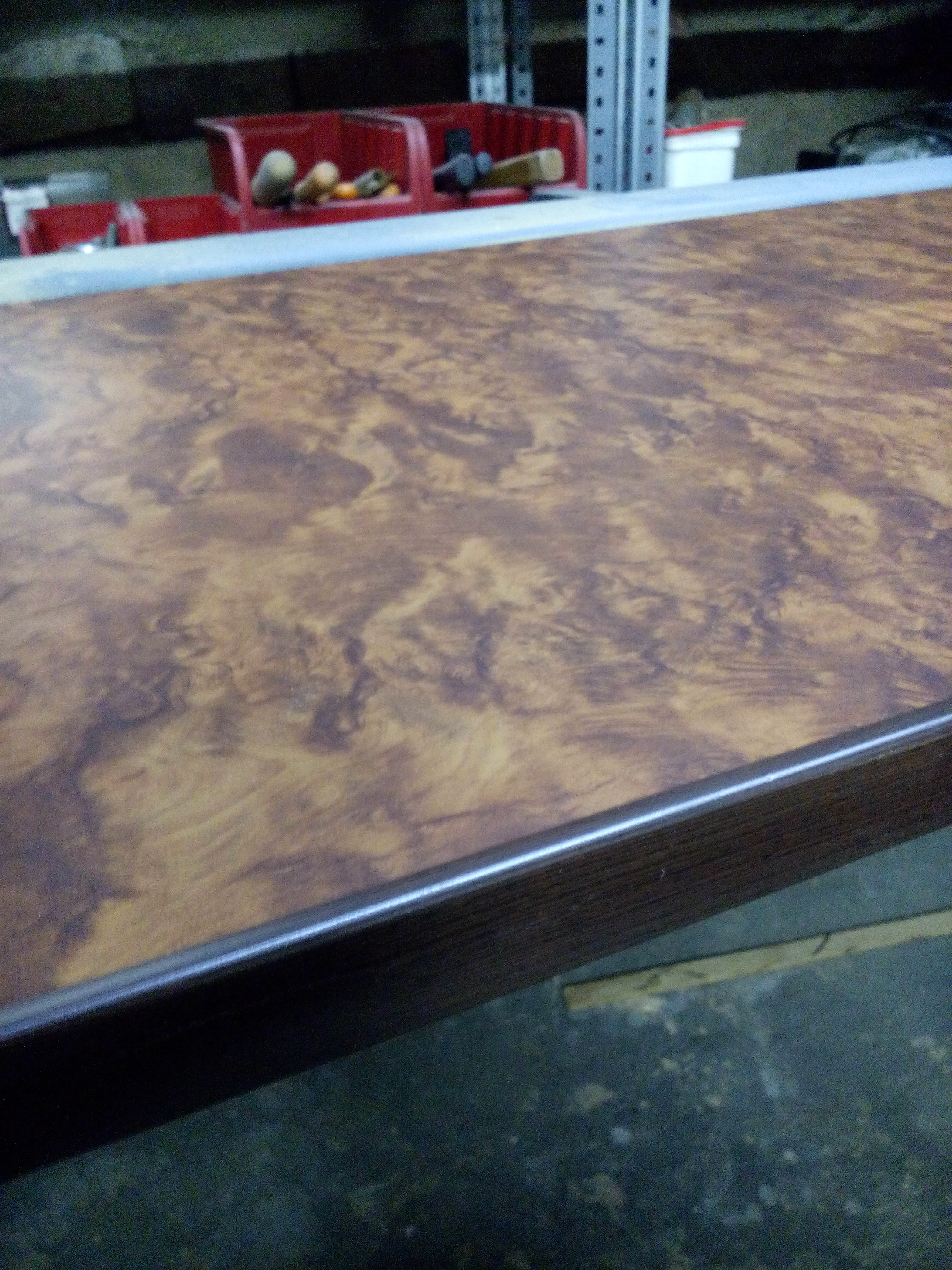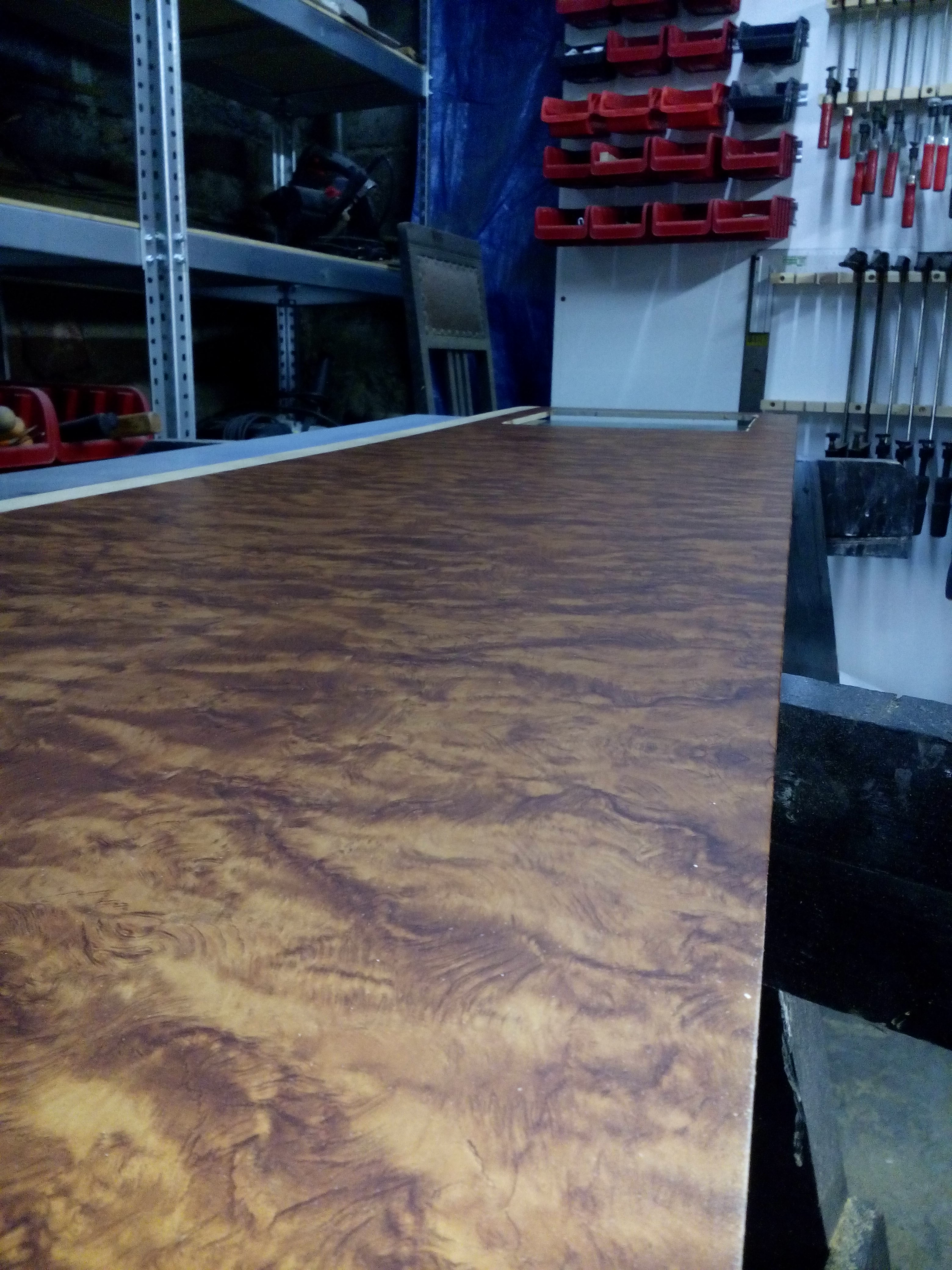 Rankiem okleiłem blat przy pomocy opalarki i wyszło elegancko, bez fałd, zmarszczek i jednym słowem zaraz wyląduje w przyczepie. Klejony punktowo do szkieletu szafek.
