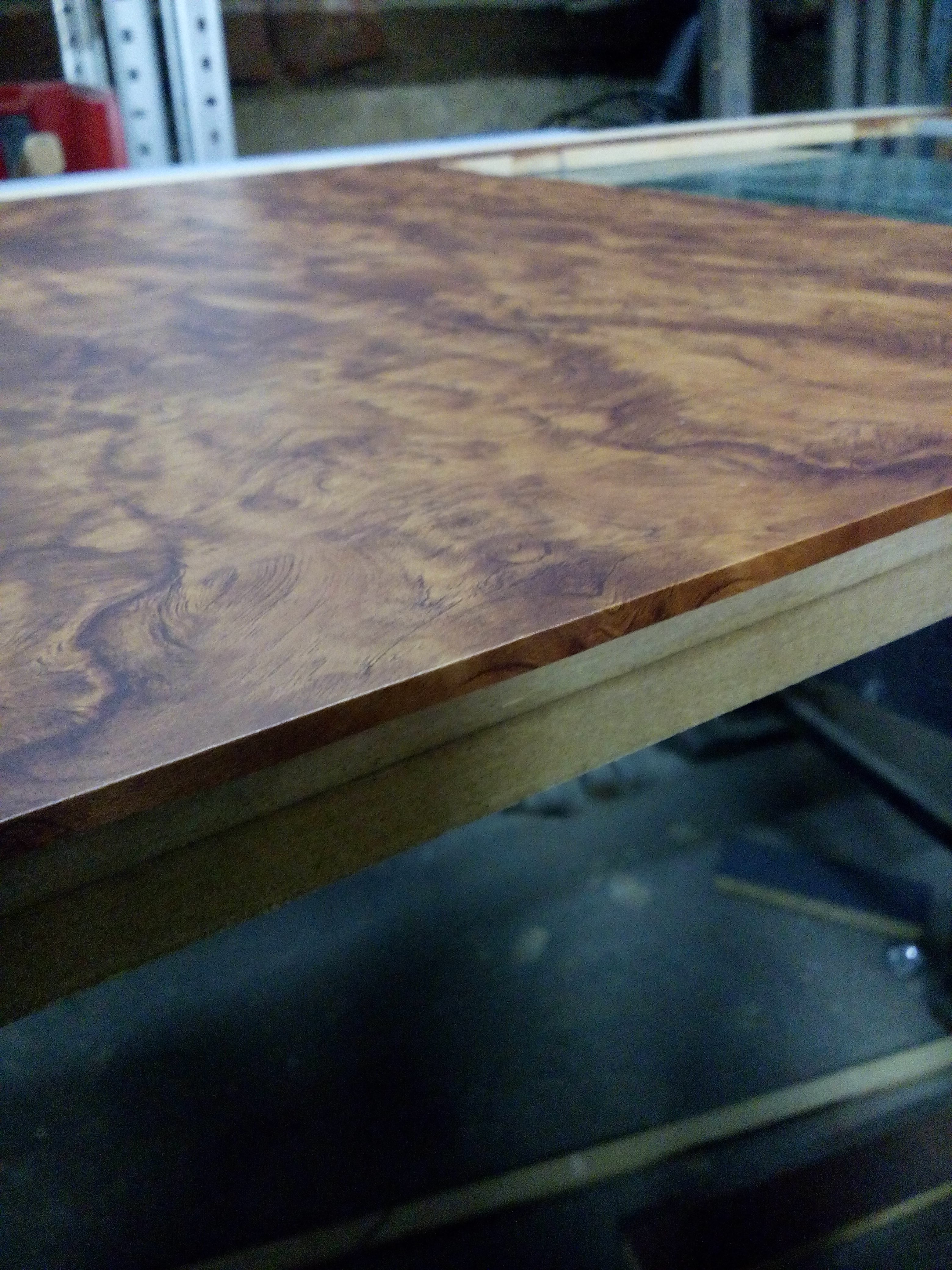 Blat jest grubości 8 mm i doklejony z przodu blatu jest pasek MDF grubości 10 mm i szerokości 1,5 cm razem daje nam grubość 18 mm i mogłem wtedy nałożyć plastikowe wykończenie blatu.