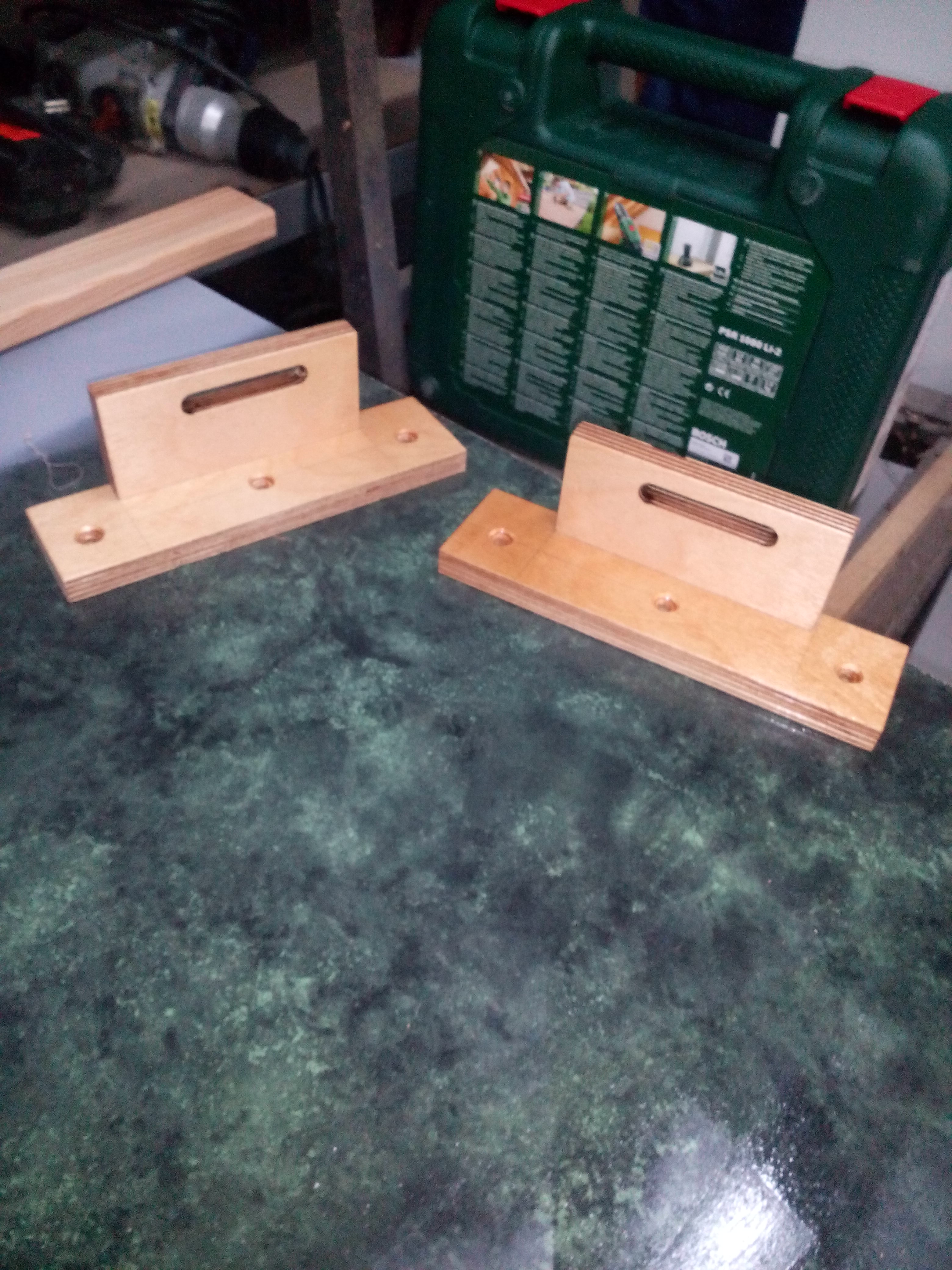Zapomniałem dodać, że sklejki do wykonania uchwytów użyłem grubości 10 mm ( na zdjęciach wygląda na grubszą ) skręconych trzema wkrętami, uprzednio nawierciłem pilotowe otwory pod wkręty.