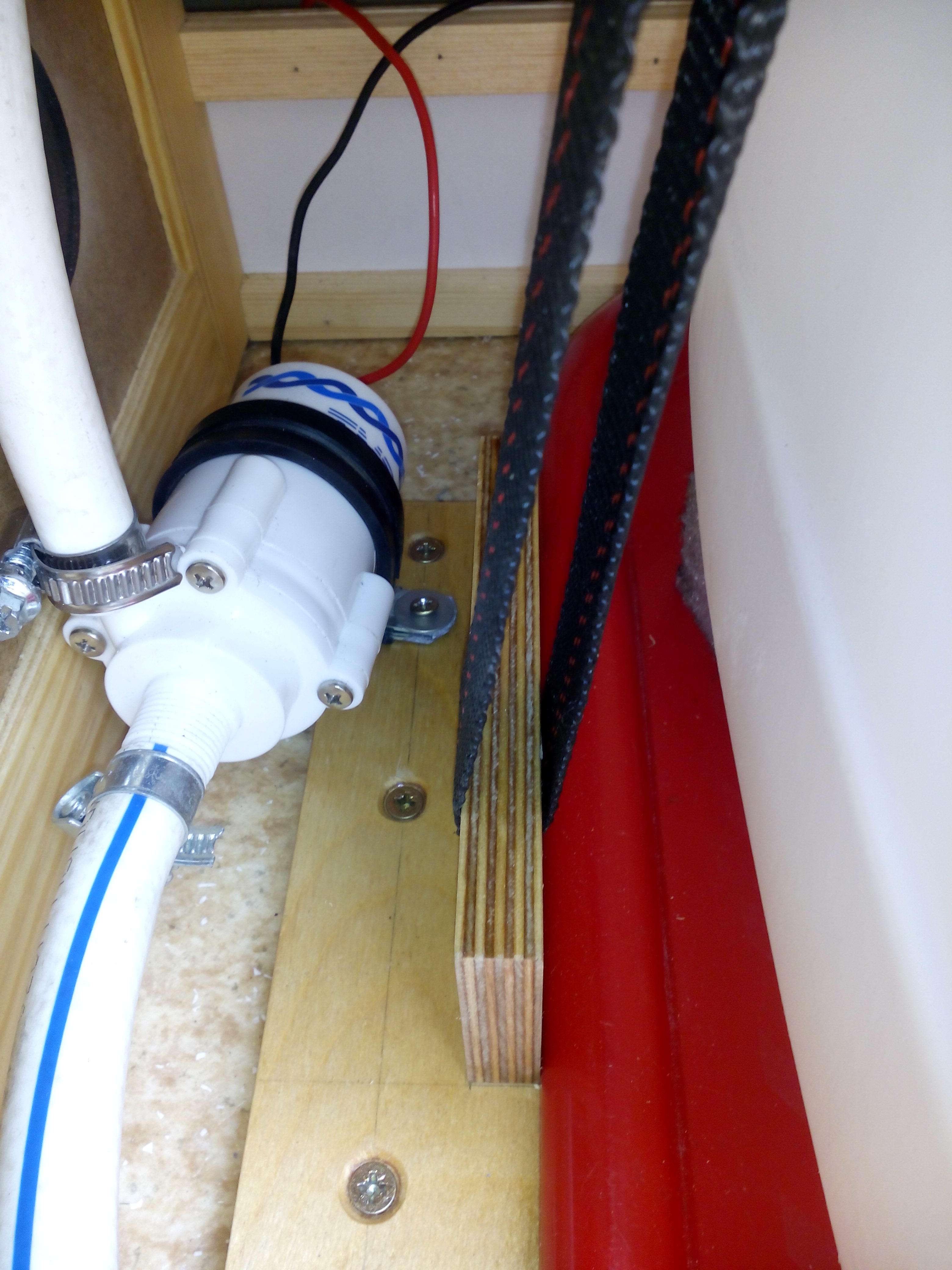 Zbiornik na wodę został przytwierdzony pasem ściągającym do zamocowanych wcześniej uchwytów, które są na zdjęciach. Uniemożliwia to jego przesuwanie się podczas jazdy i ostrego hamowania. Pod zbiornikiem jest podstawka jako okap. Woda skrapla się na zbiorniku i ścieka po nim na podłogę. Problem rozwiązałem właśnie stosując podstawkę pod zbiornikiem. Dodatkowo zbiornik jest ułożony powyżej podstawki na spienionym PVC grubości 50 mm. Musiałem go dźwignąć z dwóch powodów. Woda w podstawce i pompa wody , która musi być zamontowana poniżej linii wody.