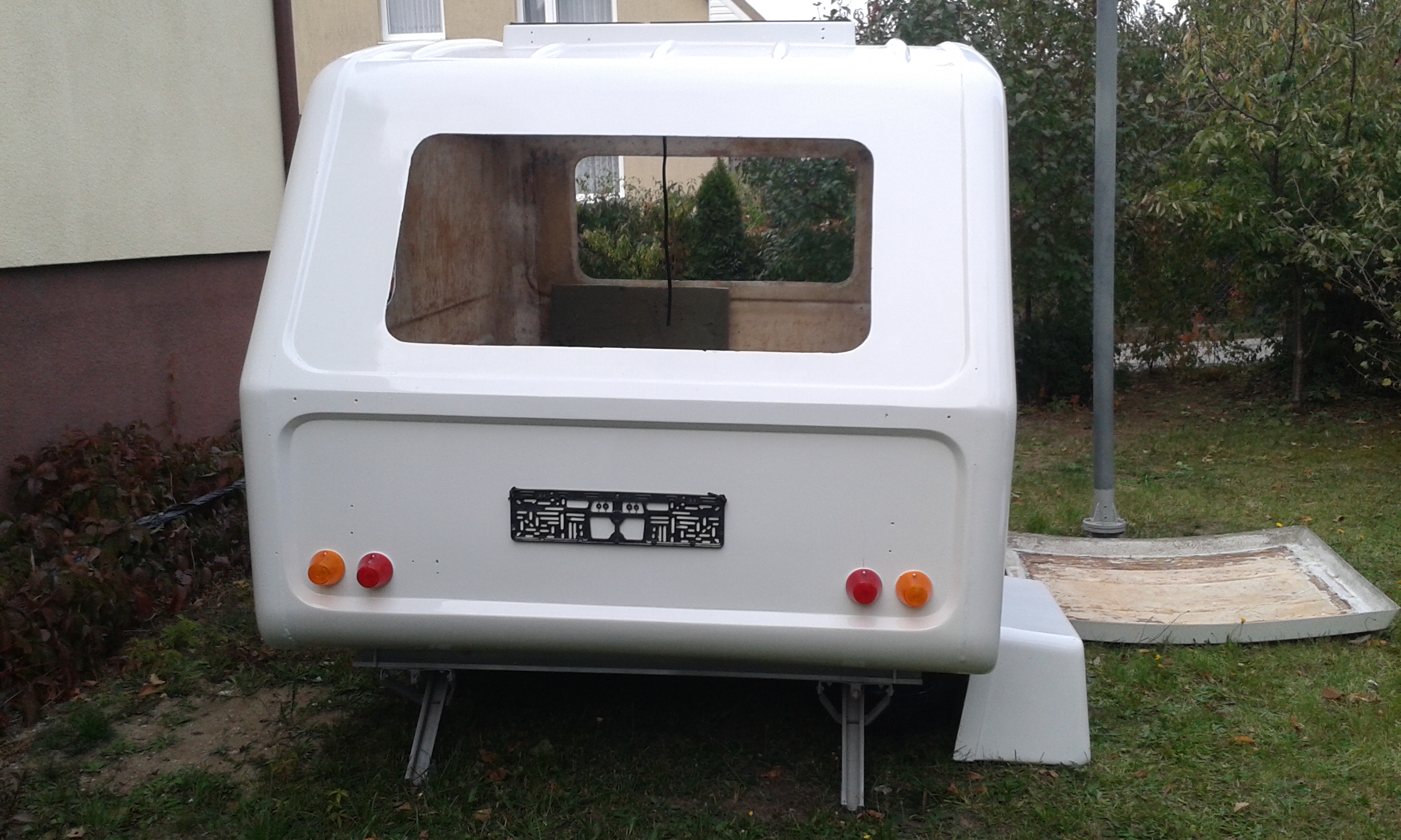 Z zewnątrz zdemontowane wszystko co było zamontowane czyli odblaski, światła, listwy. Budka została pomalowana, jednak nie wiem czy było coś połatane, jeżeli tak to nie wiem jak to było zrobione. Na dachu znalazłem małą dziurkę. No ale lakieru nie będę ruszał tylko otworek jakoś połatam. Ja odciąłem śruby mocujące budkę do ramy. Rama wydaje się być zdrowa. Z czasem wymienię oś na Alko ale to później ze względów finansowych.