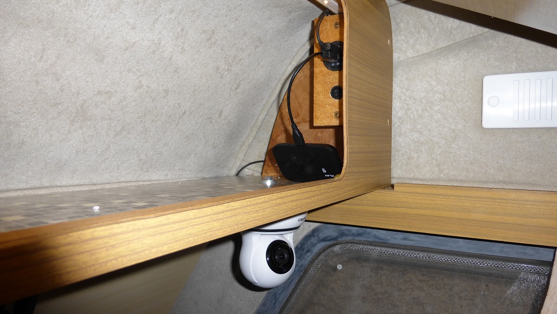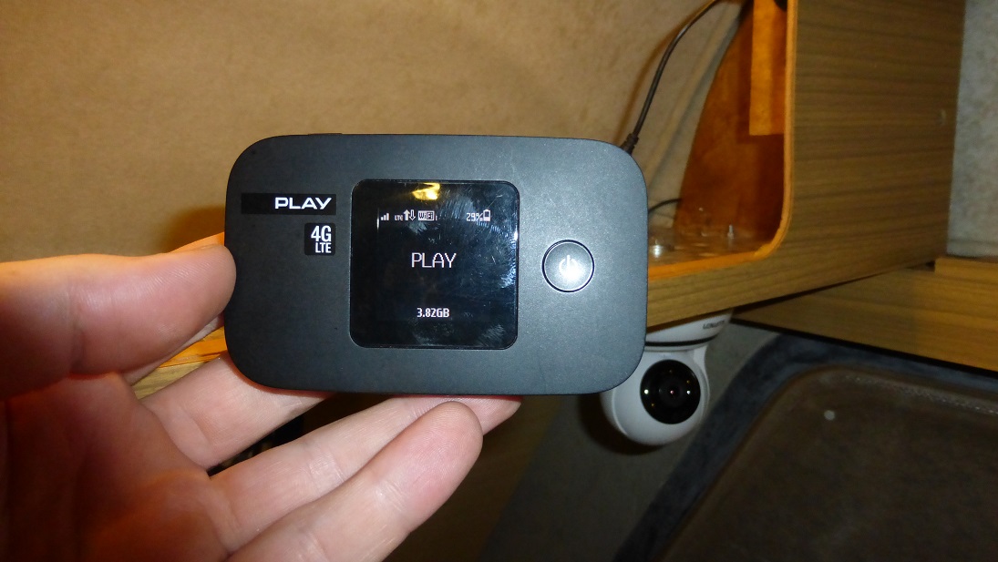 Łapie sieć świetnie ale w razie kłopotów z zasięgiem w plenerze mam jeszcze 40 cm antenę z dość długim przewodem który spokojnie wyprowadzę nawet kawałek od przyczepy. Urządzonko ma wbudowaną baterię ale aby nie było niespodzianek w szafce jest zamontowane pokazane kilka postów wcześniej podwójne gniazdo USB. Zasila ono kamerkę i router.